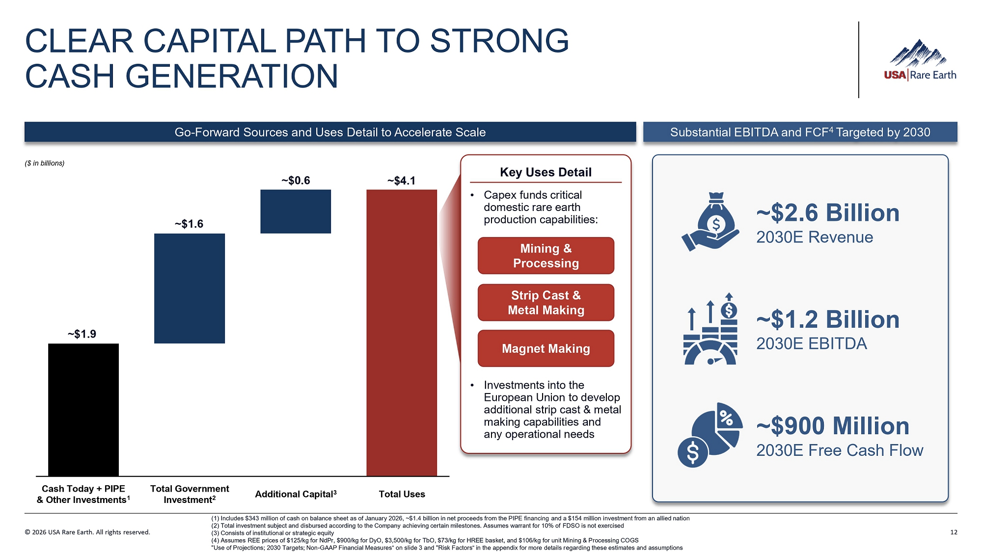 11 © 2026 USA Rare Earth. All rights reserved. TRANSFORMATIVE INVESTMENT EXPECTED TO EXPEDITE REALIZATION OF A TRUE COMMERCIAL SCALE REE VALUE CHAIN FOR USAR Metal Making 2026E 2027E 2028E 2029E 2030E 2026E 2027E 2028E 2029E 2030E 2026E 2027E 2028E 2029E 2030E Source: management projections (1) Total capacity for Round Top and third party MREC processing; includes separated oxides and HREE basket (2) Includes swarf recycling (3) USG Investment terms based on terms in non - binding LOI, which specifies certain requirements for entering into binding agreemen ts; funding is on a “milestones achieved” basis. See "Risk Factors” in the appendix (4) Estimated ~$4.1bn in required capex to achieve target 2030 estimated results 2,000tpa Base case capacity in 2030 Magnet Making 2 (production units in tpa) 4,800tpa Base case capacity in 2030 ~10,000tpa Accelerated case capacity in 2030 ~27,500tpa Accelerated case capacity in 2030 Mining & Processing 1 Base Case was Contingent on Capital Raise ~8,000tpa Accelerated case capacity in 2030 (production units in tpa) (production units in tpa) 0 10,000 0 28,000 0 10,000 After USG Investment 3,4 Before USG Investment 3