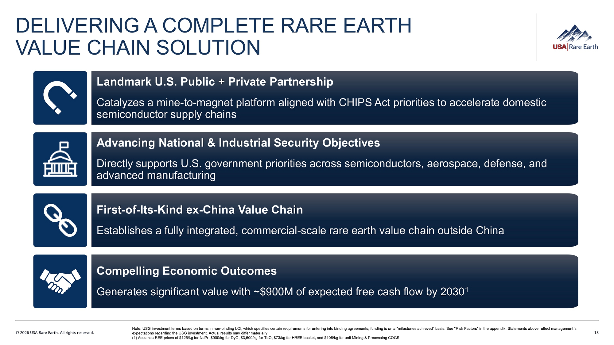 12 © 2026 USA Rare Earth. All rights reserved. CLEAR CAPITAL PATH TO STRONG CASH GENERATION Go - Forward Sources and Uses Detail to Accelerate Scale ($ in billions) Substantial EBITDA and FCF 4 Targeted by 2030 Cash Today + PIPE & Other Investments 1 Total Uses Total Government Investment 2 Additional Capital 3 (1) Includes $343 million of cash on balance sheet as of January 2026, ~$1.4 billion in net proceeds from the PIPE financing and a $154 million investment from an allied nation (2) Total investment subject and disbursed according to the Company achieving certain milestones. Assumes warrant for 10% of FDS O is not exercised (3) Consists of institutional or strategic equity (4) Assumes REE prices of $125/kg for NdPr , $900/kg for DyO , $3,500/kg for TbO , $73/kg for HREE basket, and $106/kg for unit Mining & Processing COGS "Use of Projections; 2030 Targets; Non - GAAP Financial Measures“ on slide 3 and "Risk Factors“ in the appendix for more details r egarding these estimates and assumptions ~$1.9 ~$1.6 ~$0.6 ~$4.1 Key Uses Detail • Capex funds critical domestic rare earth production capabilities: • Investments into the European Union to develop additional strip cast & metal making capabilities and any operational needs Mining & Processing Magnet Making Strip Cast & Metal Making ~$2.6 Billion 2030E Revenue ~$1.2 Billion 2030E EBITDA ~$900 Million 2030E Free Cash Flow