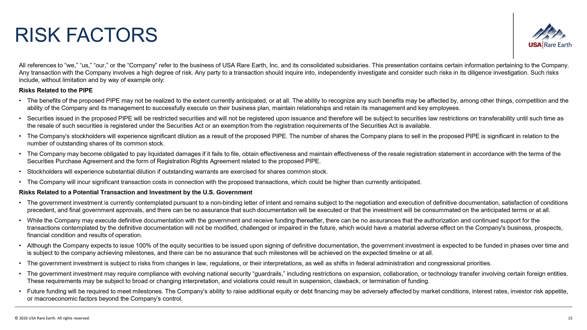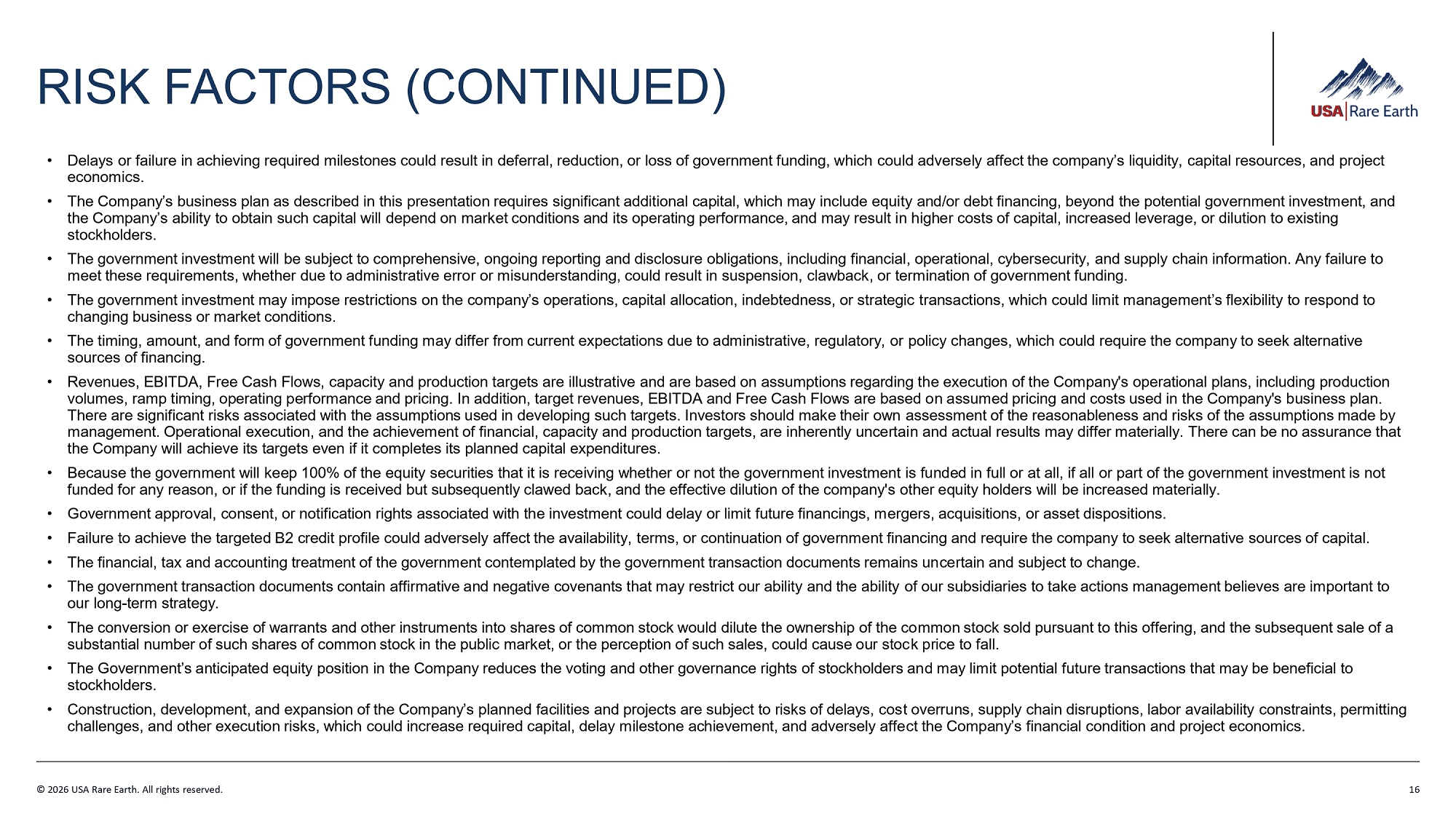 15 © 2026 USA Rare Earth. All rights reserved. RISK FACTORS All references to “we,” “us,” “our,” or the “Company” refer to the business of USA Rare Earth, Inc. and its consolidated subs idi aries. This presentation contains certain information pertaining to the Company. Any transaction with the Company involves a high degree of risk. Any party to a transaction should inquire into, independentl y i nvestigate and consider such risks in its diligence investigation. Such risks include, without limitation and by way of example only: Risks Related to the PIPE • The benefits of the proposed PIPE may not be realized to the extent currently anticipated, or at all. The ability to recogniz e a ny such benefits may be affected by, among other things, competition and the ability of the Company and its management to successfully execute on their business plan, maintain relationships and retain i ts management and key employees. • Securities issued in the proposed PIPE will be restricted securities and will not be registered upon issuance and therefore w ill be subject to securities law restrictions on transferability until such time as the resale of such securities is registered under the Securities Act or an exemption from the registration requirements of th e S ecurities Act is available. • The Company’s stockholders will experience significant dilution as a result of the proposed PIPE. The number of shares the Co mpa ny plans to sell in the proposed PIPE is significant in relation to the number of outstanding shares of its common stock. • The Company may become obligated to pay liquidated damages if it fails to file, obtain effectiveness and maintain effectivene ss of the resale registration statement in accordance with the terms of the Securities Purchase Agreement and the form of Registration Rights Agreement related to the proposed PIPE. • Stockholders will experience substantial dilution if outstanding warrants are exercised for shares common stock. • The Company will incur significant transaction costs in connection with the proposed transactions, which could be higher than cu rrently anticipated. Risks Related to a Potential Transaction and Investment by the U.S. Government • The government investment is currently contemplated pursuant to a non - binding letter of intent and remains subject to the negoti ation and execution of definitive documentation, satisfaction of conditions precedent, and final government approvals, and there can be no assurance that such documentation will be executed or that the in vestment will be consummated on the anticipated terms or at all. • While the Company may execute definitive documentation with the government and receive funding thereafter, there can be no as sur ances that the authorization and continued support for the transactions contemplated by the definitive documentation will not be modified, challenged or impaired in the future, which w oul d have a material adverse effect on the Company's business, prospects, financial condition and results of operation. • Although the Company expects to issue 100% of the equity securities to be issued upon signing of definitive documentation, th e g overnment investment is expected to be funded in phases over time and is subject to the company achieving milestones, and there can be no assurance that such milestones will be achieved on the ex pec ted timeline or at all. • The government investment is subject to risks from changes in law, regulations, or their interpretations, as well as shifts i n f ederal administration and congressional priorities. • The government investment may require compliance with evolving national security “guardrails,” including restrictions on expa nsi on, collaboration, or technology transfer involving certain foreign entities. These requirements may be subject to broad or changing interpretation, and violations could result in suspension, clawback , or termination of funding. • Future funding will be required to meet milestones. The Company’s ability to raise additional equity or debt financing may be ad versely affected by market conditions, interest rates, investor risk appetite, or macroeconomic factors beyond the Company’s control.