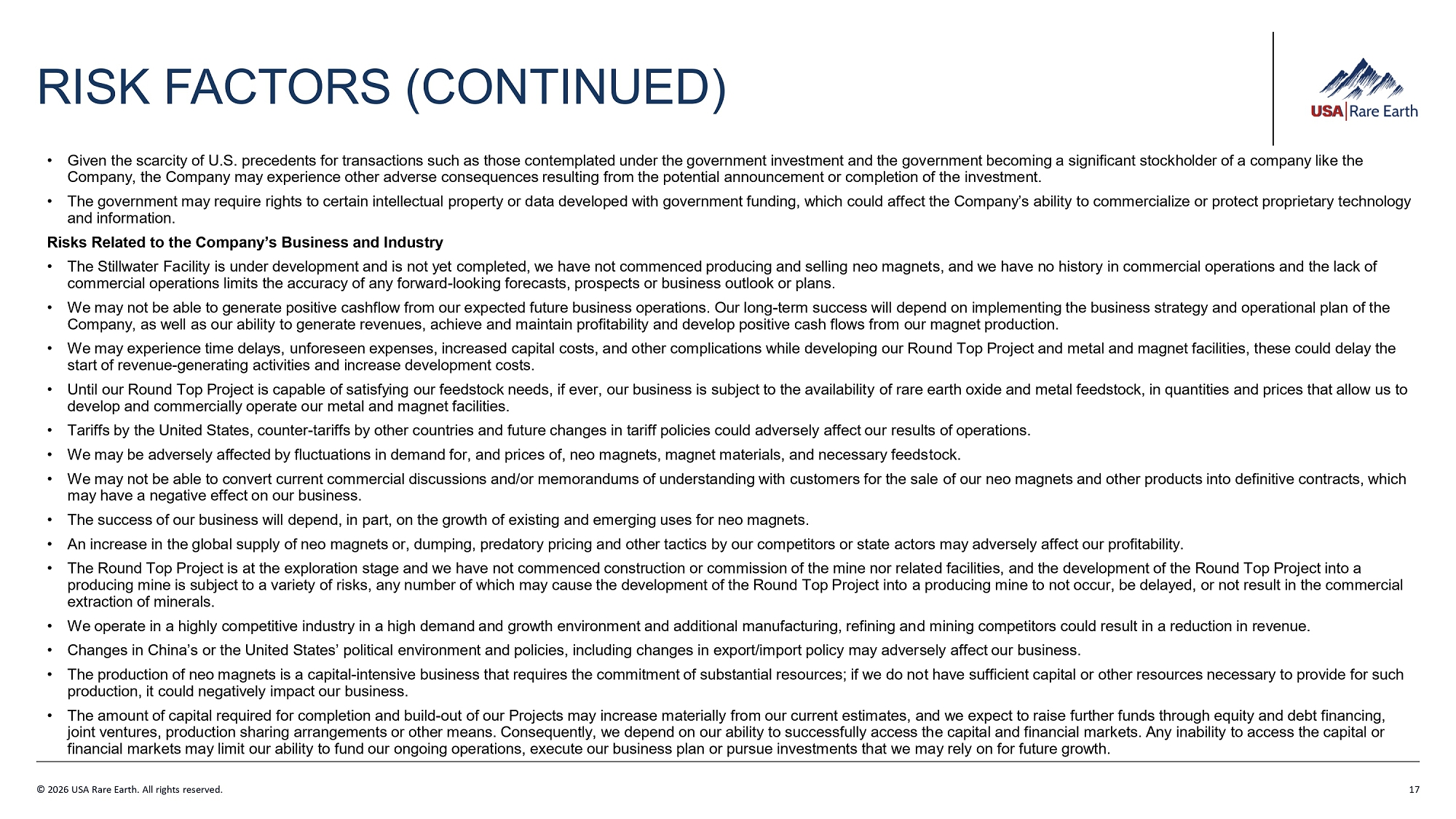 16 © 2026 USA Rare Earth. All rights reserved. RISK FACTORS (CONTINUED) • Delays or failure in achieving required milestones could result in deferral, reduction, or loss of government funding, which cou ld adversely affect the company’s liquidity, capital resources, and project economics. • The Company’s business plan as described in this presentation requires significant additional capital, which may include equi ty and/or debt financing, beyond the potential government investment, and the Company’s ability to obtain such capital will depend on market conditions and its operating performance, and may result i n h igher costs of capital, increased leverage, or dilution to existing stockholders. • The government investment will be subject to comprehensive, ongoing reporting and disclosure obligations, including financial , o perational, cybersecurity, and supply chain information. Any failure to meet these requirements, whether due to administrative error or misunderstanding, could result in suspension, clawback , or termination of government funding. • The government investment may impose restrictions on the company’s operations, capital allocation, indebtedness, or strategic tr ansactions, which could limit management’s flexibility to respond to changing business or market conditions. • The timing, amount, and form of government funding may differ from current expectations due to administrative, regulatory, or po licy changes, which could require the company to seek alternative sources of financing. • Revenues, EBITDA, Free Cash Flows, capacity and production targets are illustrative and are based on assumptions regarding th e e xecution of the Company's operational plans, including production volumes, ramp timing, operating performance and pricing. In addition, target revenues, EBITDA and Free Cash Flows are based o n a ssumed pricing and costs used in the Company's business plan. There are significant risks associated with the assumptions used in developing such targets. Investors should make their own ass essment of the reasonableness and risks of the assumptions made by management. Operational execution, and the achievement of financial, capacity and production targets, are inherently uncertai n a nd actual results may differ materially. There can be no assurance that the Company will achieve its targets even if it completes its planned capital expenditures. • Because the government will keep 100% of the equity securities that it is receiving whether or not the government investment is funded in full or at all, if all or part of the government investment is not funded for any reason, or if the funding is received but subsequently clawed back, and the effective dilution of the company' s o ther equity holders will be increased materially. • Government approval, consent, or notification rights associated with the investment could delay or limit future financings, m erg ers, acquisitions, or asset dispositions. • Failure to achieve the targeted B2 credit profile could adversely affect the availability, terms, or continuation of governme nt financing and require the company to seek alternative sources of capital. • The financial, tax and accounting treatment of the government contemplated by the government transaction documents remains un cer tain and subject to change. • The government transaction documents contain affirmative and negative covenants that may restrict our ability and the ability of our subsidiaries to take actions management believes are important to our long - term strategy. • The conversion or exercise of warrants and other instruments into shares of common stock would dilute the ownership of the co mmo n stock sold pursuant to this offering, and the subsequent sale of a substantial number of such shares of common stock in the public market, or the perception of such sales, could cause our stoc k p rice to fall. • The Government’s anticipated equity position in the Company reduces the voting and other governance rights of stockholders an d m ay limit potential future transactions that may be beneficial to stockholders. • Construction, development, and expansion of the Company’s planned facilities and projects are subject to risks of delays, cos t o verruns, supply chain disruptions, labor availability constraints, permitting challenges, and other execution risks, which could increase required capital, delay milestone achievement, and adversely affe ct the Company’s financial condition and project economics.