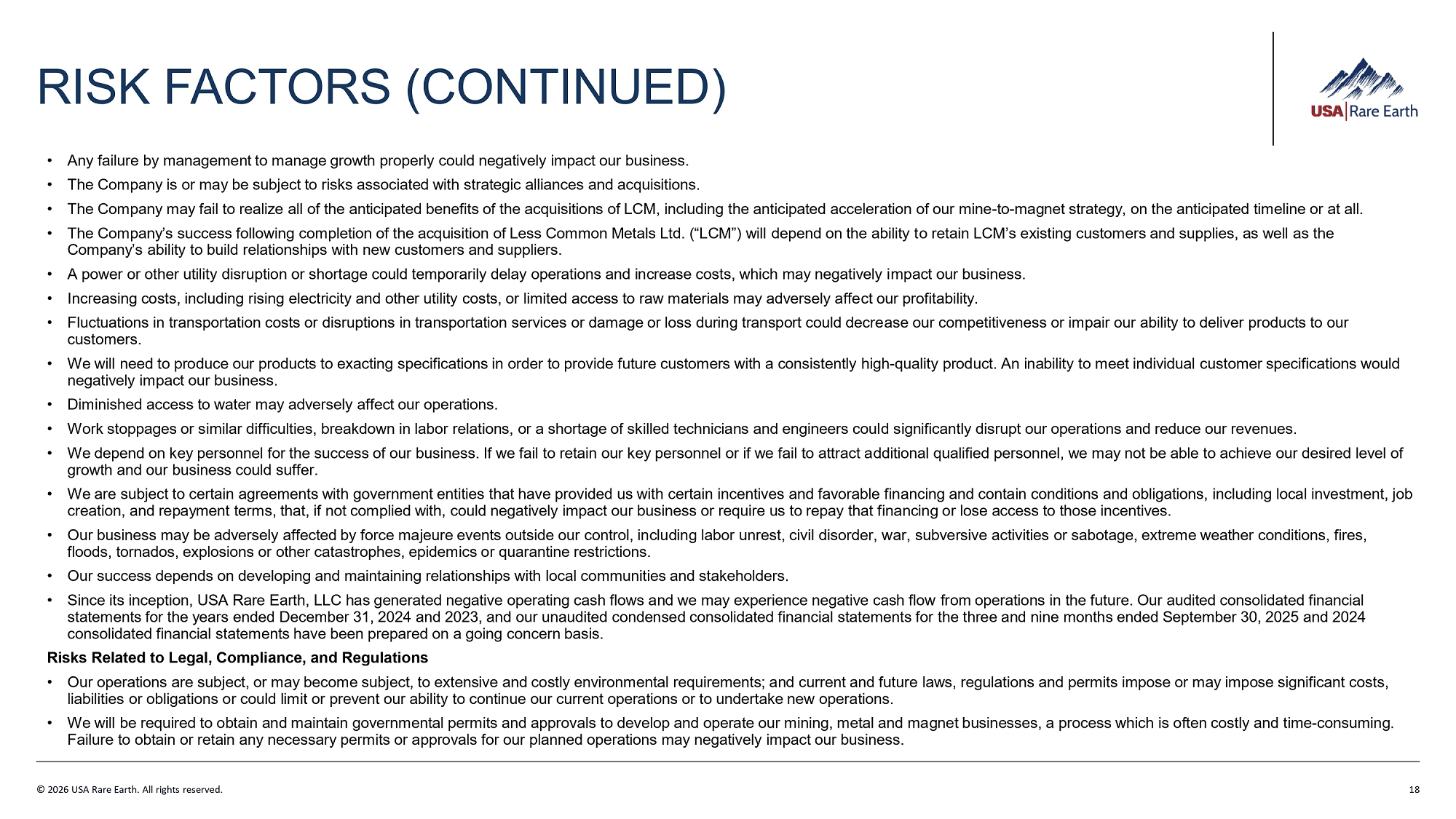 17 © 2026 USA Rare Earth. All rights reserved. RISK FACTORS (CONTINUED) • Given the scarcity of U.S. precedents for transactions such as those contemplated under the government investment and the gov ern ment becoming a significant stockholder of a company like the Company, the Company may experience other adverse consequences resulting from the potential announcement or completion of the in vestment. • The government may require rights to certain intellectual property or data developed with government funding, which could aff ect the Company’s ability to commercialize or protect proprietary technology and information. Risks Related to the Company’s Business and Industry • The Stillwater Facility is under development and is not yet completed, we have not commenced producing and selling neo magnet s, and we have no history in commercial operations and the lack of commercial operations limits the accuracy of any forward - looking forecasts, prospects or business outlook or plans. • We may not be able to generate positive cashflow from our expected future business operations. Our long - term success will depend on implementing the business strategy and operational plan of the Company, as well as our ability to generate revenues, achieve and maintain profitability and develop positive cash flows from ou r magnet production. • We may experience time delays, unforeseen expenses, increased capital costs, and other complications while developing our Rou nd Top Project and metal and magnet facilities, these could delay the start of revenue - generating activities and increase development costs. • Until our Round Top Project is capable of satisfying our feedstock needs, if ever, our business is subject to the availabilit y o f rare earth oxide and metal feedstock, in quantities and prices that allow us to develop and commercially operate our metal and magnet facilities. • Tariffs by the United States, counter - tariffs by other countries and future changes in tariff policies could adversely affect ou r results of operations. • We may be adversely affected by fluctuations in demand for, and prices of, neo magnets, magnet materials, and necessary feeds toc k. • We may not be able to convert current commercial discussions and/or memorandums of understanding with customers for the sale of our neo magnets and other products into definitive contracts, which may have a negative effect on our business. • The success of our business will depend, in part, on the growth of existing and emerging uses for neo magnets. • An increase in the global supply of neo magnets or, dumping, predatory pricing and other tactics by our competitors or state act ors may adversely affect our profitability. • The Round Top Project is at the exploration stage and we have not commenced construction or commission of the mine nor relate d f acilities, and the development of the Round Top Project into a producing mine is subject to a variety of risks, any number of which may cause the development of the Round Top Project into a p roducing mine to not occur, be delayed, or not result in the commercial extraction of minerals. • We operate in a highly competitive industry in a high demand and growth environment and additional manufacturing, refining an d m ining competitors could result in a reduction in revenue. • Changes in China’s or the United States’ political environment and policies, including changes in export/import policy may adver sely affect our business. • The production of neo magnets is a capital - intensive business that requires the commitment of substantial resources; if we do no t have sufficient capital or other resources necessary to provide for such production, it could negatively impact our business. • The amount of capital required for completion and build - out of our Projects may increase materially from our current estimates, and we expect to raise further funds through equity and debt financing, joint ventures, production sharing arrangements or other means. Consequently, we depend on our ability to successfully access th e capital and financial markets. Any inability to access the capital or financial markets may limit our ability to fund our ongoing operations, execute our business plan or pursue investments that we may rely on for future growth.
