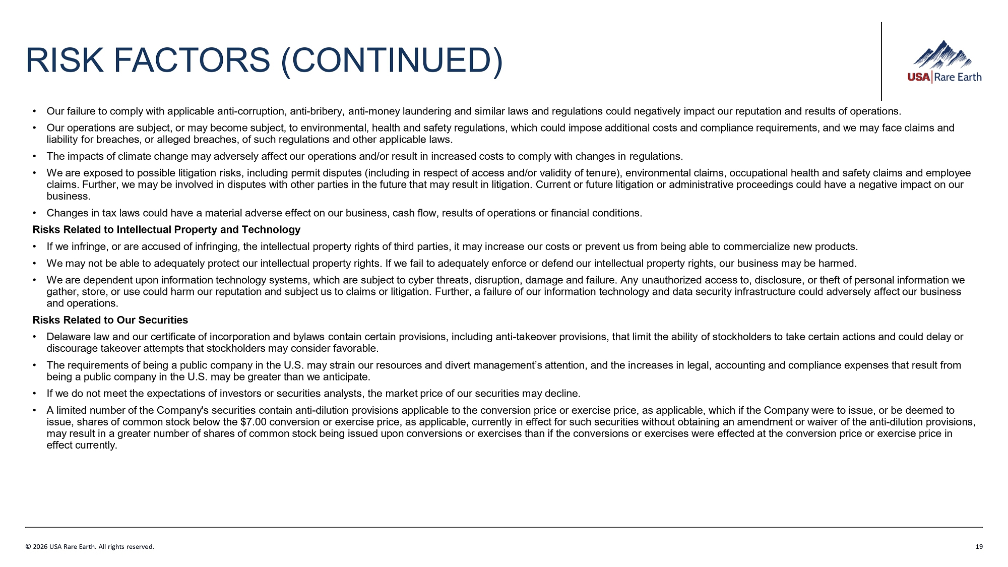 18 © 2026 USA Rare Earth. All rights reserved. RISK FACTORS (CONTINUED) • Any failure by management to manage growth properly could negatively impact our business. • The Company is or may be subject to risks associated with strategic alliances and acquisitions. • The Company may fail to realize all of the anticipated benefits of the acquisitions of LCM, including the anticipated acceler ati on of our mine - to - magnet strategy, on the anticipated timeline or at all. • The Company’s success following completion of the acquisition of Less Common Metals Ltd. (“LCM”) will depend on the ability t o r etain LCM’s existing customers and supplies, as well as the Company’s ability to build relationships with new customers and suppliers. • A power or other utility disruption or shortage could temporarily delay operations and increase costs, which may negatively i mpa ct our business. • Increasing costs, including rising electricity and other utility costs, or limited access to raw materials may adversely affe ct our profitability. • Fluctuations in transportation costs or disruptions in transportation services or damage or loss during transport could decre ase our competitiveness or impair our ability to deliver products to our customers. • We will need to produce our products to exacting specifications in order to provide future customers with a consistently high - qu ality product. An inability to meet individual customer specifications would negatively impact our business. • Diminished access to water may adversely affect our operations. • Work stoppages or similar difficulties, breakdown in labor relations, or a shortage of skilled technicians and engineers coul d s ignificantly disrupt our operations and reduce our revenues. • We depend on key personnel for the success of our business. If we fail to retain our key personnel or if we fail to attract a ddi tional qualified personnel, we may not be able to achieve our desired level of growth and our business could suffer. • We are subject to certain agreements with government entities that have provided us with certain incentives and favorable fin anc ing and contain conditions and obligations, including local investment, job creation, and repayment terms, that, if not complied with, could negatively impact our business or require us to repay that f ina ncing or lose access to those incentives. • Our business may be adversely affected by force majeure events outside our control, including labor unrest, civil disorder, w ar, subversive activities or sabotage, extreme weather conditions, fires, floods, tornados, explosions or other catastrophes, epidemics or quarantine restrictions. • Our success depends on developing and maintaining relationships with local communities and stakeholders. • Since its inception, USA Rare Earth, LLC has generated negative operating cash flows and we may experience negative cash flow fr om operations in the future. Our audited consolidated financial statements for the years ended December 31, 2024 and 2023, and our unaudited condensed consolidated financial statements for the three and nine months ended September 30, 2025 and 2024 consolidated financial statements have been prepared on a going concern basis. Risks Related to Legal, Compliance, and Regulations • Our operations are subject, or may become subject, to extensive and costly environmental requirements; and current and future la ws, regulations and permits impose or may impose significant costs, liabilities or obligations or could limit or prevent our ability to continue our current operations or to undertake new opera tio ns. • We will be required to obtain and maintain governmental permits and approvals to develop and operate our mining, metal and ma gne t businesses, a process which is often costly and time - consuming. Failure to obtain or retain any necessary permits or approvals for our planned operations may negatively impact our business.