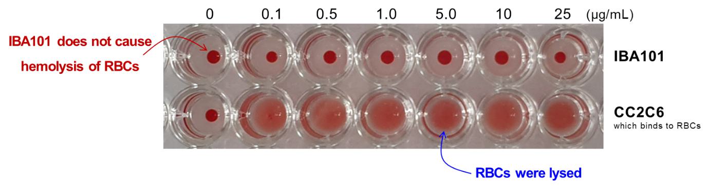Top row: intact RBC pellets with clear supernatant after IBA101 treatment (no hemolysis).