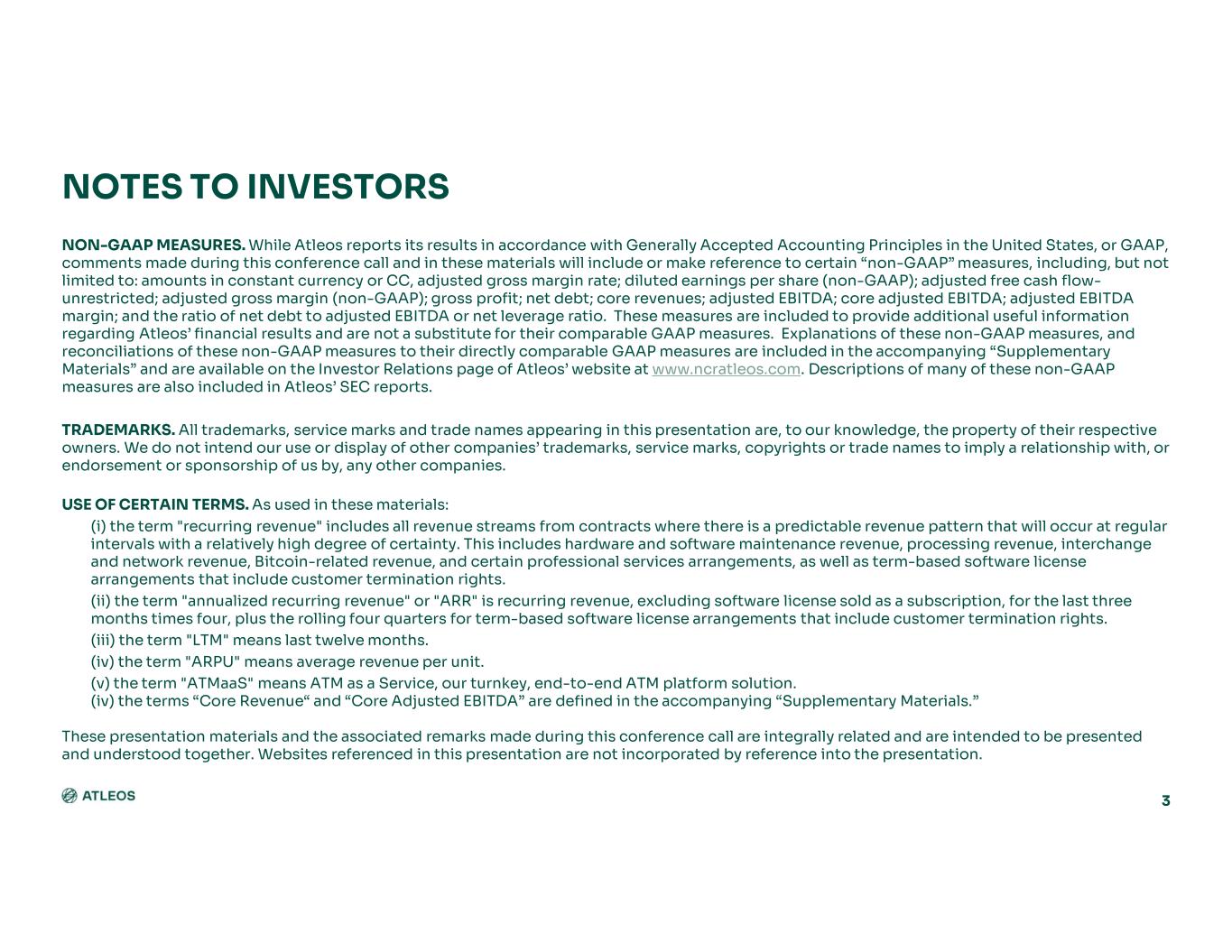 3 NON-GAAP MEASURES. While Atleos reports its results in accordance with Generally Accepted Accounting Principles in the United States, or GAAP, comments made during this conference call and in these materials will include or make reference to certain “non-GAAP” measures, including, but not limited to: amounts in constant currency or CC, adjusted gross margin rate; diluted earnings per share (non-GAAP); adjusted free cash flow- unrestricted; adjusted gross margin (non-GAAP); gross profit; net debt; core revenues; adjusted EBITDA; core adjusted EBITDA; adjusted EBITDA margin; and the ratio of net debt to adjusted EBITDA or net leverage ratio. These measures are included to provide additional useful information regarding Atleos’ financial results and are not a substitute for their comparable GAAP measures. Explanations of these non-GAAP measures, and reconciliations of these non-GAAP measures to their directly comparable GAAP measures are included in the accompanying “Supplementary Materials” and are available on the Investor Relations page of Atleos’ website at www.ncratleos.com. Descriptions of many of these non-GAAP measures are also included in Atleos’ SEC reports. TRADEMARKS. All trademarks, service marks and trade names appearing in this presentation are, to our knowledge, the property of their respective owners. We do not intend our use or display of other companies’ trademarks, service marks, copyrights or trade names to imply a relationship with, or endorsement or sponsorship of us by, any other companies. USE OF CERTAIN TERMS. As used in these materials: (i) the term "recurring revenue" includes all revenue streams from contracts where there is a predictable revenue pattern that will occur at regular intervals with a relatively high degree of certainty. This includes hardware and software maintenance revenue, processing revenue, interchange and network revenue, Bitcoin-related revenue, and certain professional services arrangements, as well as term-based software license arrangements that include customer termination rights. (ii) the term "annualized recurring revenue" or "ARR" is recurring revenue, excluding software license sold as a subscription, for the last three months times four, plus the rolling four quarters for term-based software license arrangements that include customer termination rights. (iii) the term "LTM" means last twelve months. (iv) the term "ARPU" means average revenue per unit. (v) the term "ATMaaS" means ATM as a Service, our turnkey, end-to-end ATM platform solution. (iv) the terms “Core Revenue“ and “Core Adjusted EBITDA” are defined in the accompanying “Supplementary Materials.” These presentation materials and the associated remarks made during this conference call are integrally related and are intended to be presented and understood together. Websites referenced in this presentation are not incorporated by reference into the presentation. NOTES TO INVESTORS