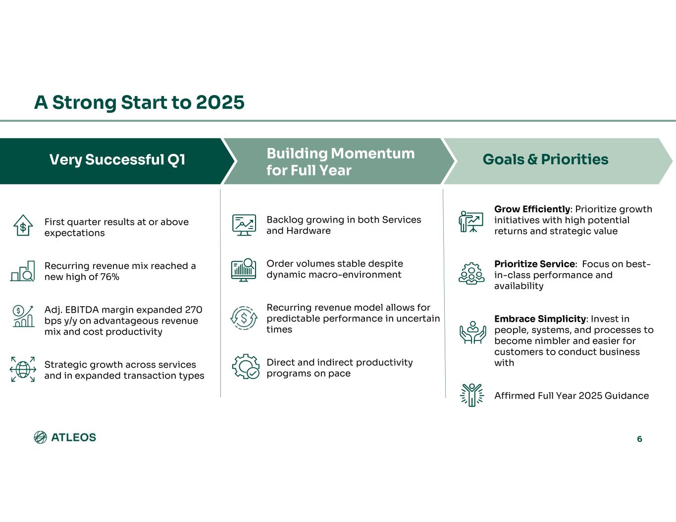 5 NCR ATLEOS Industry Leading Self-Service Banking Solutions Platform +600K Global installed base of serviced ATMs ~80K Largest independent network of owned and operated ATMs +140 Countries ~20K Employees Largest Independent ATM Network Transaction Processing Device Design & Production Extensive Hardware & Software Services Full Outsourcing Capabilities Software Design & Licensing #1 ATMaaS and Managed Services Provider #1 Independently owned and operated ATM network globally #1 Provider of multi-vendor ATM software applications and middleware