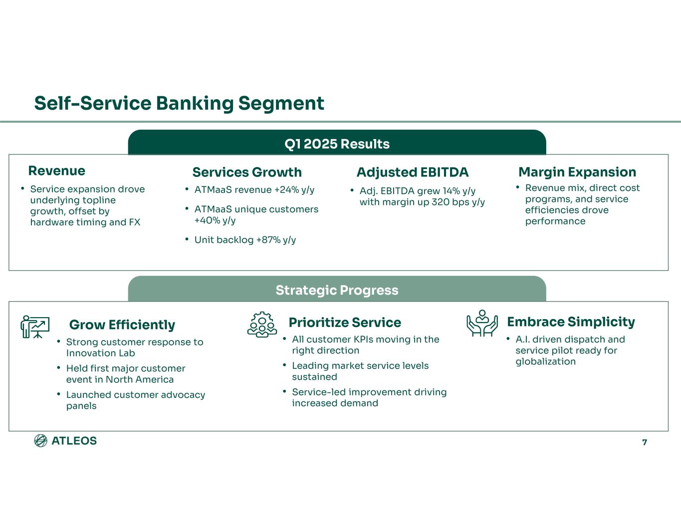 First quarter results at or above expectations Recurring revenue mix reached a new high of 76% Adj. EBITDA margin expanded 270 bps y/y on advantageous revenue mix and cost productivity Strategic growth across services and in expanded transaction types 6 A Strong Start to 2025 Very Successful Q1 Building Momentum for Full Year Goals & Priorities Backlog growing in both Services and Hardware Order volumes stable despite dynamic macro-environment Recurring revenue model allows for predictable performance in uncertain times Direct and indirect productivity programs on pace Grow Efficiently: Prioritize growth initiatives with high potential returns and strategic value Prioritize Service: Focus on best- in-class performance and availability Embrace Simplicity: Invest in people, systems, and processes to become nimbler and easier for customers to conduct business with Affirmed Full Year 2025 Guidance