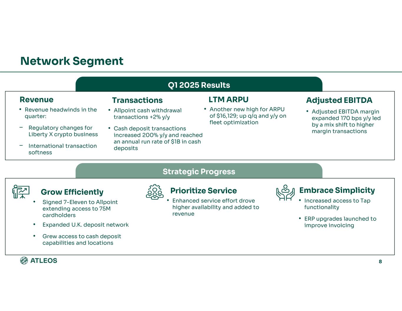 7 Self-Service Banking Segment Q1 2025 Results • Revenue mix, direct cost programs, and service efficiencies drove performance • ATMaaS revenue +24% y/y • ATMaaS unique customers +40% y/y • Unit backlog +87% y/y • Adj. EBITDA grew 14% y/y with margin up 320 bps y/y • Service expansion drove underlying topline growth, offset by hardware timing and FX Revenue Adjusted EBITDAServices Growth Margin Expansion Strategic Progress Grow Efficiently Prioritize Service Embrace Simplicity • Strong customer response to Innovation Lab • Held first major customer event in North America • Launched customer advocacy panels • All customer KPIs moving in the right direction • Leading market service levels sustained • Service-led improvement driving increased demand • A.I. driven dispatch and service pilot ready for globalization