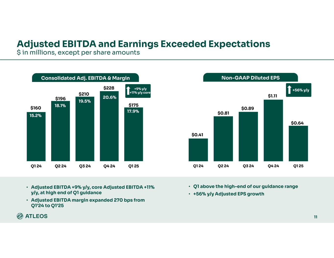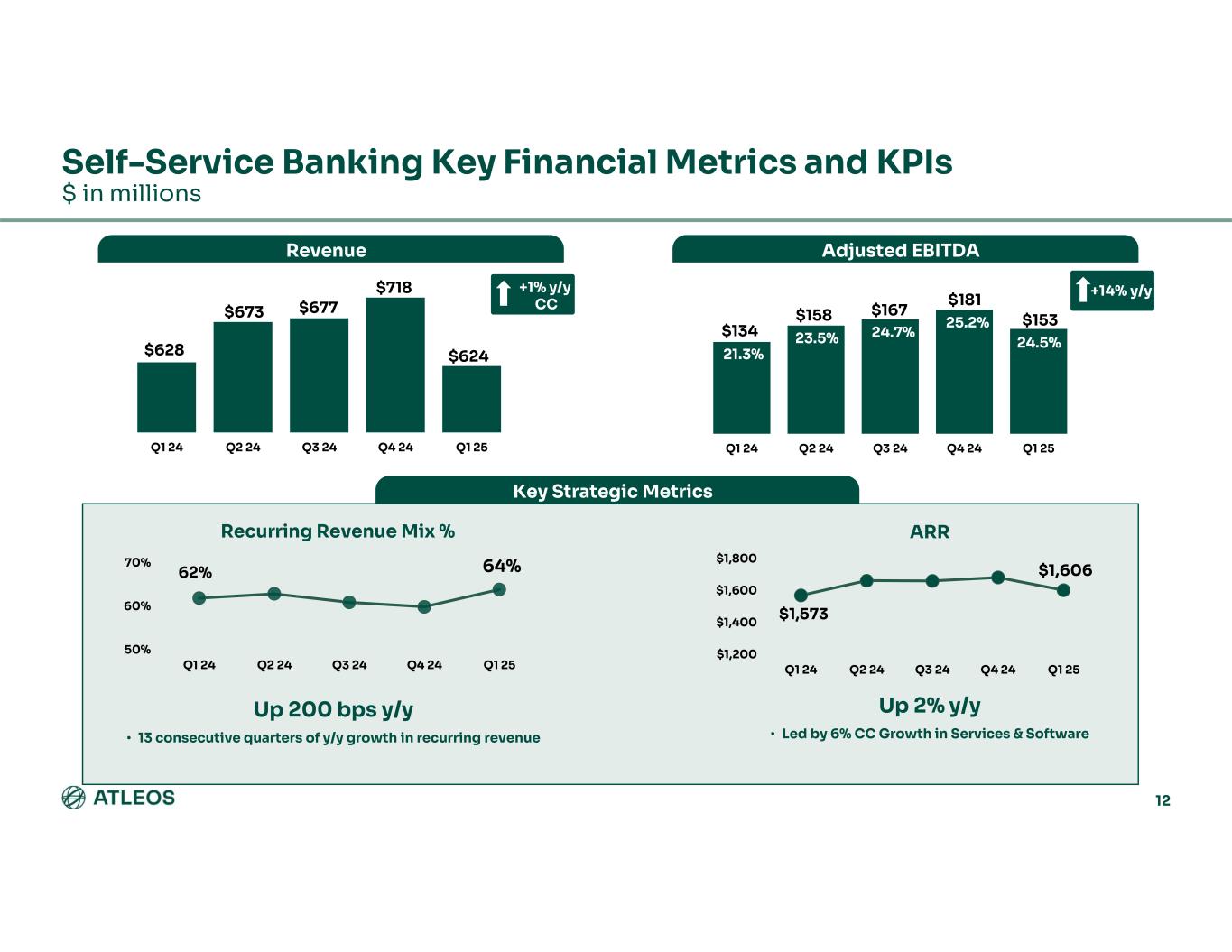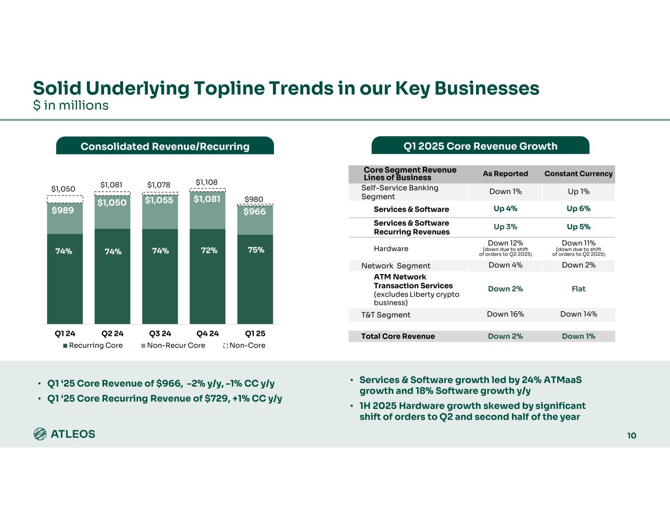 % ChangeQ1 2024Q1 2025 (7)%$1,050$980Revenue 5%244257Adjusted Gross Margin (non-GAAP) 23.2%26.2%Adjusted Gross Margin Rate (non-GAAP) (2)%128125Adjusted Operating Expenses (non-GAAP) 12.2%12.8%% of Revenue 14%116132Adjusted Income from Operations (non-GAAP) 11.0%13.5%% of Revenue (Adjusted Operating Margin Rate) (11)%(75)(67)Adjusted Interest and other expense (non-GAAP) 64%1118Adjusted Income Tax Expense (non-GAAP) 26.8%27.7%Adjusted Effective Income Tax Rate (non-GAAP) 60%$30$48Adjusted Net Income attributable to Atleos (non-GAAP) 56%$0.41$0.64Diluted EPS attributable to Atleos (non-GAAP) $ in millions, except per share amounts Q1 2025 OPERATIONAL RESULTS (Non-GAAP) 24