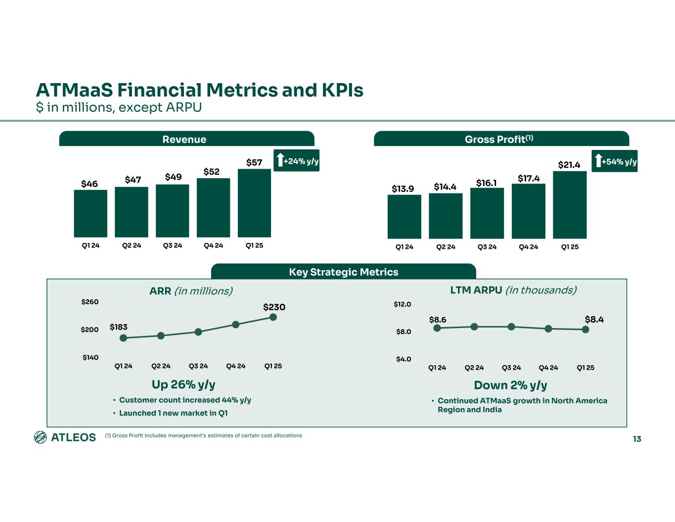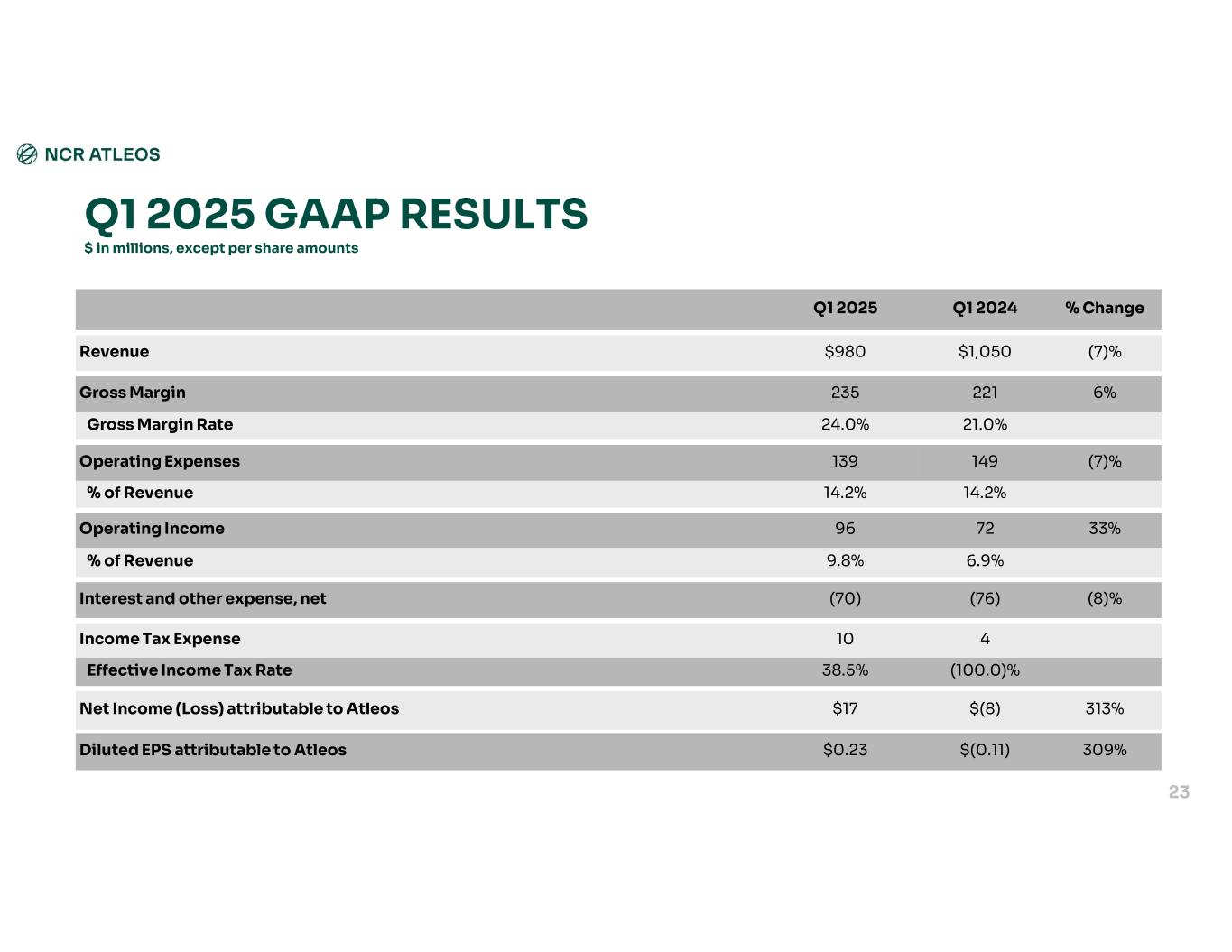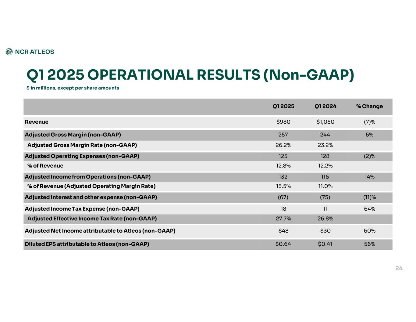 % Change Q1 2024Q1 2025 (7)%$1,050$980Revenue 6%221235Gross Margin 21.0%24.0%Gross Margin Rate (7)%149139Operating Expenses 14.2%14.2%% of Revenue 33%7296Operating Income 6.9%9.8%% of Revenue (8)%(76)(70)Interest and other expense, net 410Income Tax Expense (100.0)%38.5%Effective Income Tax Rate 313%$(8)$17Net Income (Loss) attributable to Atleos 309%$(0.11)$0.23Diluted EPS attributable to Atleos $ in millions, except per share amounts Q1 2025 GAAP RESULTS 23