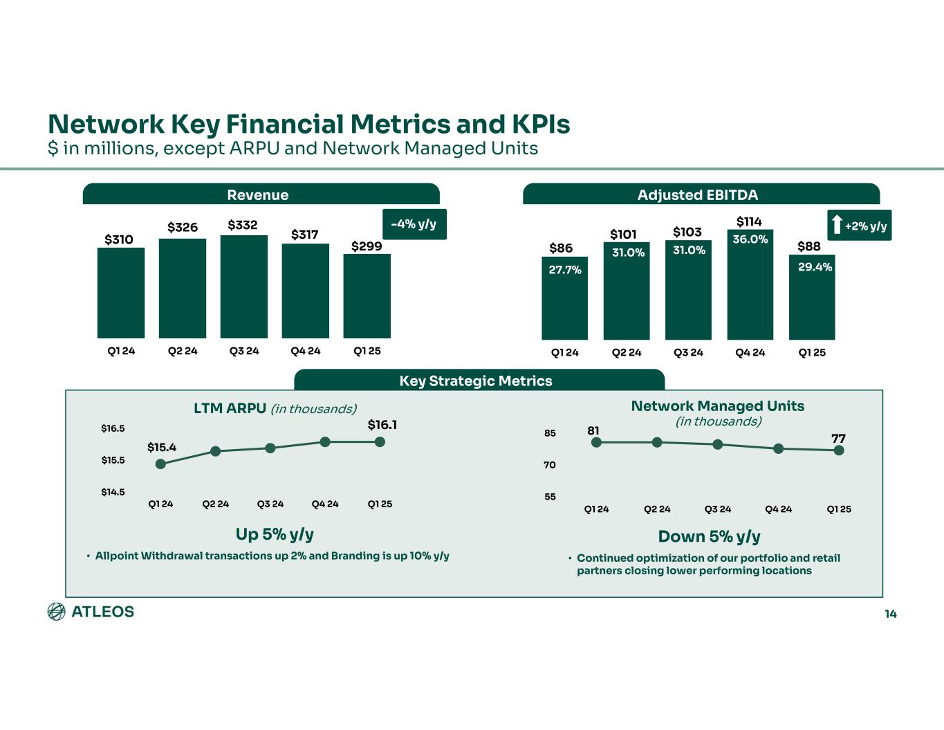13 ATMaaS Financial Metrics and KPIs $ in millions, except ARPU Revenue Gross Profit(1) Key Strategic Metrics Q1 24 Q2 24 Q3 24 Q4 24 Q1 25 $49$47$46 $52 Q1 24 Q2 24 Q3 24 Q4 24 Q1 25 $16.1$14.4 $17.4 Up 26% y/y • Customer count increased 44% y/y • Launched 1 new market in Q1 Down 2% y/y • Continued ATMaaS growth in North America Region and India $140 $200 $260 Q1 24 Q2 24 Q3 24 Q4 24 Q1 25 ARR (in millions) $183 $230 $4.0 $8.0 $12.0 Q1 24 Q2 24 Q3 24 Q4 24 Q1 25 LTM ARPU (in thousands) $8.6 $8.4 $57 $13.9 $21.4+24% y/y +54% y/y (1) Gross Profit includes management’s estimates of certain cost allocations