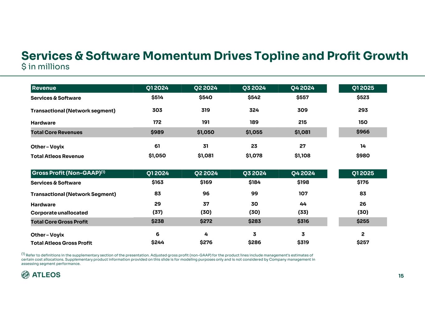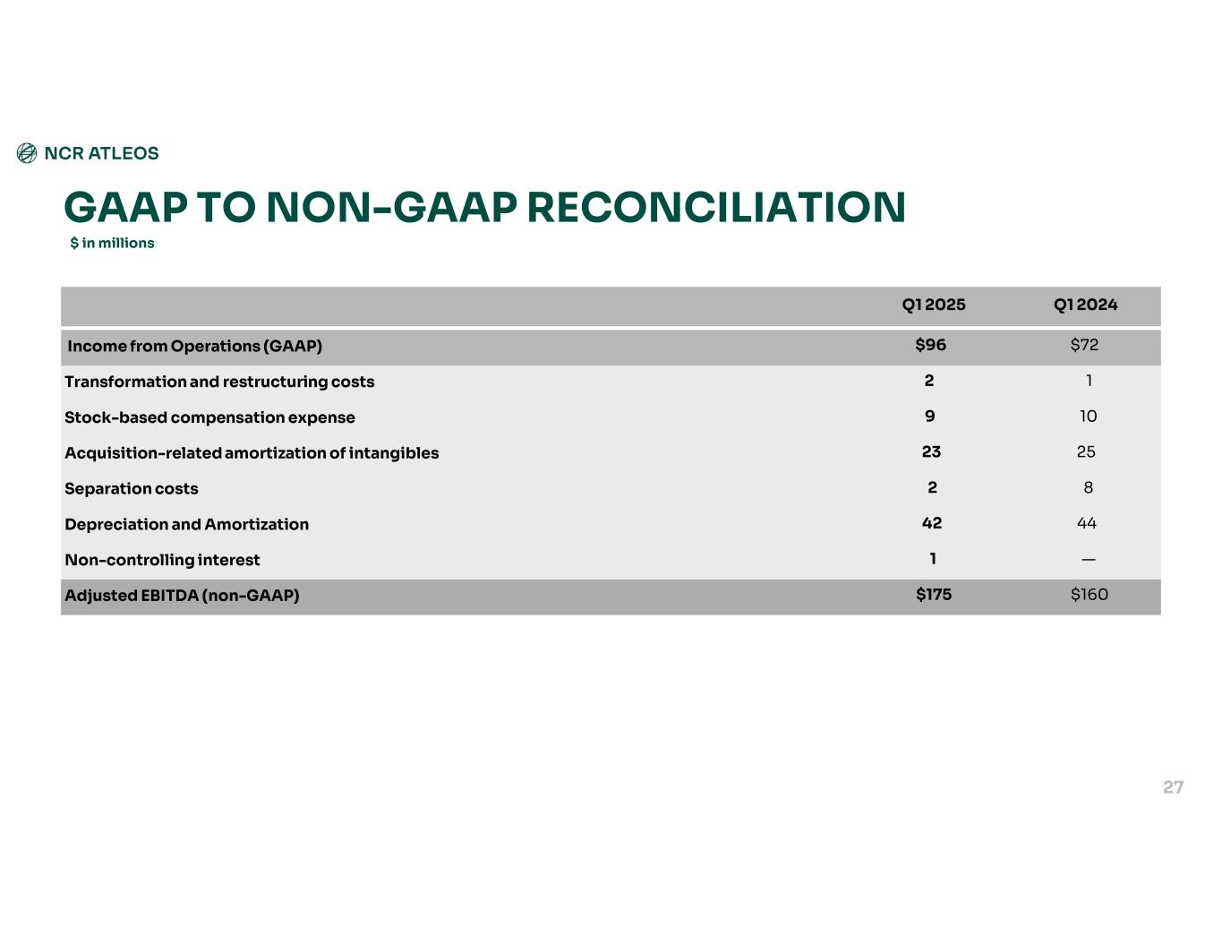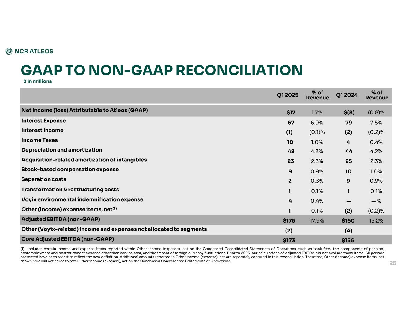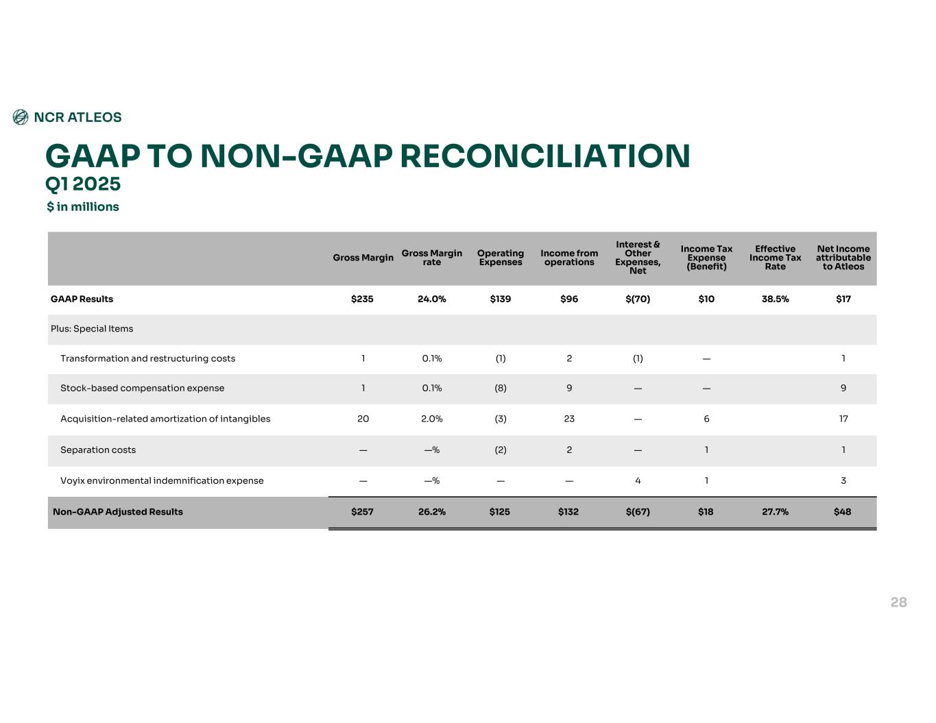 GAAP TO NON-GAAP RECONCILIATION $ in millions Net Income attributable to Atleos Effective Income Tax Rate Income Tax Expense (Benefit) Interest & Other Expenses, Net Income from operations Operating Expenses Gross Margin rateGross Margin $1738.5%$10$(70)$96$13924.0%$235GAAP Results Plus: Special Items 1—(1)2(1)0.1%1Transformation and restructuring costs 9——9(8)0.1%1Stock-based compensation expense 176—23(3)2.0%20Acquisition-related amortization of intangibles 11—2(2)—%—Separation costs 314———%—Voyix environmental indemnification expense $4827.7%$18$(67)$132$12526.2%$257Non-GAAP Adjusted Results Q1 2025 28