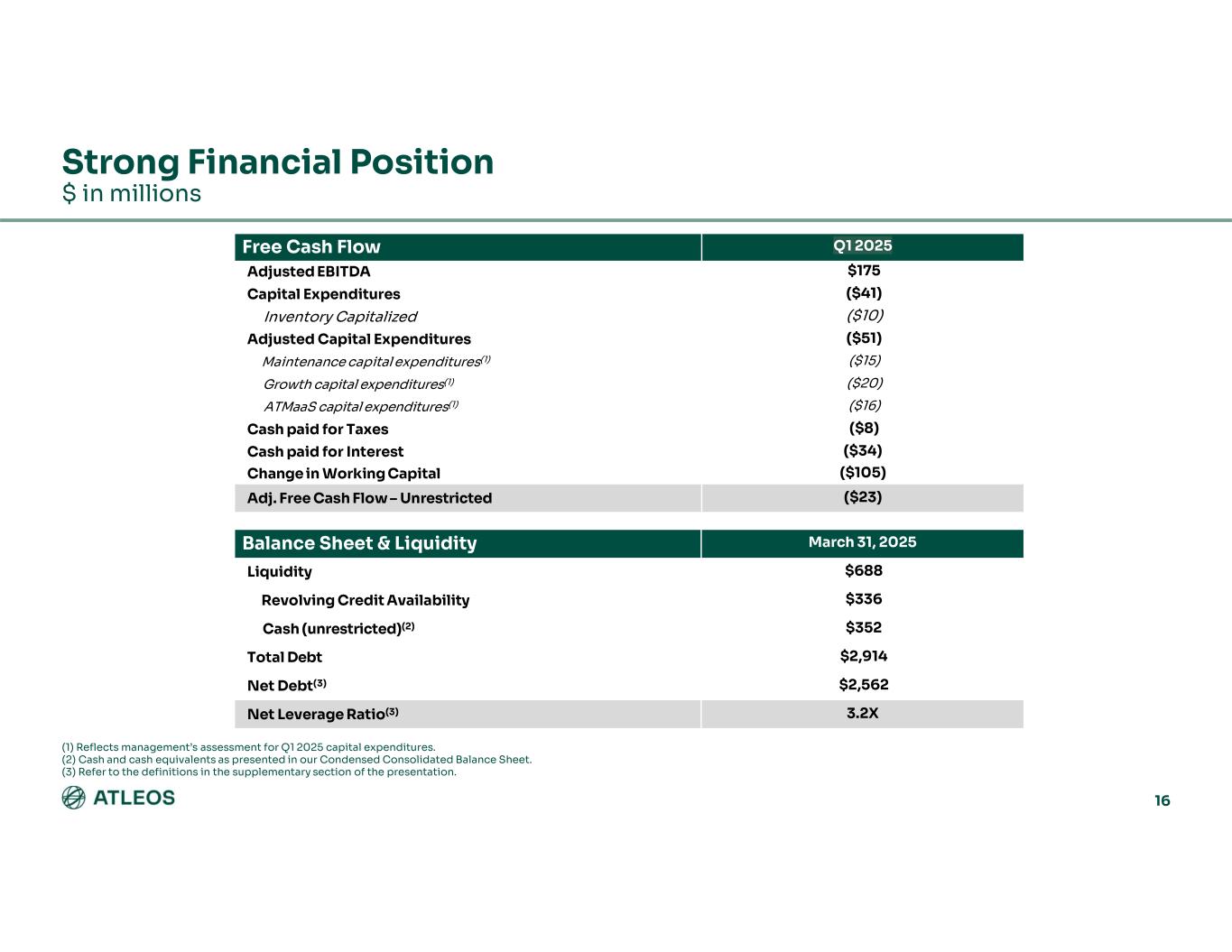 15 Services & Software Momentum Drives Topline and Profit Growth $ in millions Q1 2025Q4 2024Q3 2024Q2 2024Q1 2024Revenue $523$557$542$540 $514 Services & Software 293309324 319 303Transactional (Network segment) 150215189191 172Hardware $966$1,081$1,055 $1,050 $989 Total Core Revenues 142723 31 61Other – Voyix $980$1,108$1,078 $1,081 $1,050 Total Atleos Revenue Q1 2025Q4 2024Q3 2024Q2 2024Q1 2024Gross Profit (Non-GAAP)(1) $176$198$184$169$163Services & Software 831079996 83 Transactional (Network Segment) 264430 37 29 Hardware (30)(33)(30)(30)(37)Corporate unallocated $255$316$283$272 $238 Total Core Gross Profit 233 4 6 Other – Voyix $257$319$286$276$244Total Atleos Gross Profit (1) Refer to definitions in the supplementary section of the presentation. Adjusted gross profit (non-GAAP) for the product lines include management’s estimates of certain cost allocations. Supplementary product information provided on this slide is for modeling purposes only and is not considered by Company management in assessing segment performance.