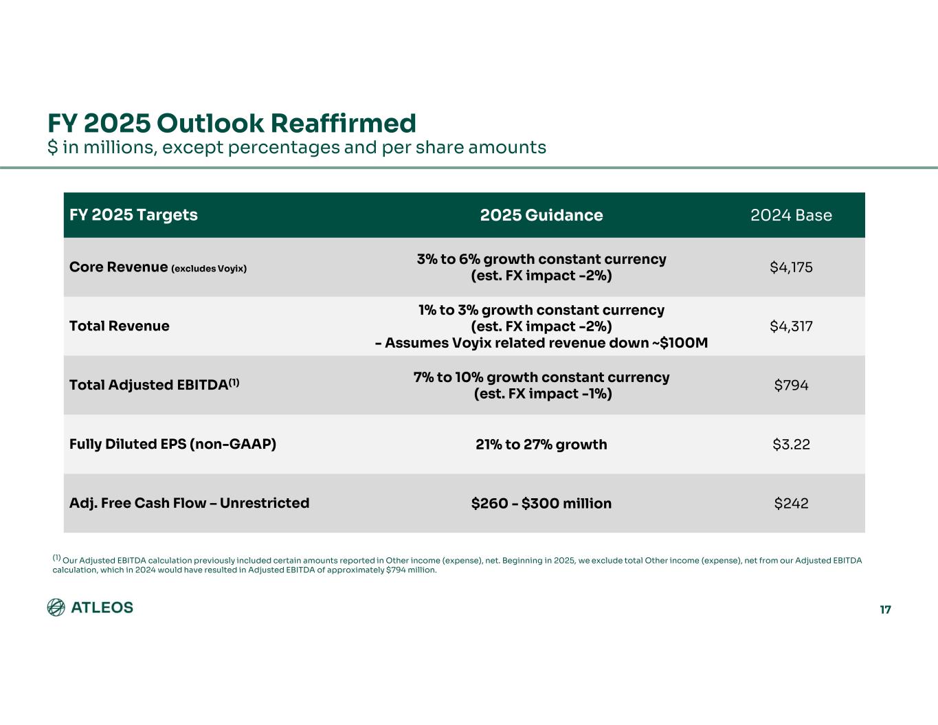 % of RevenueQ2 2024% of RevenueQ3 2024% of RevenueQ4 2024 2.7%$292.2%$244.2%$46Net Income Attributable to Atleos (GAAP) 7.3%797.3%796.5%72Interest Expense (0.2)%(2)(0.1)%(1)(0.2)%(2)Interest Income 0.4%41.3%142.2%25Income Taxes 4.0%434.2%454.0%44Depreciation and amortization expense 2.1%232.2%242.1%23Acquisition-related amortization of intangibles 0.8%90.8%90.9%10Stock-based compensation expense 0.6%60.5%5(0.1)%(1)Separation costs (0.4)%(4)(0.1)%(1)—%—Acquisition-related Costs 0.6%60.7%70.7%8Transformation and restructuring costs —%—0.2%21.1%12Voyix environmental indemnification expense —%——%—(3.4)%(38)Pension mark-to-market adjustments —%——%—1.8%20Loss on Debt Extinguishment 0.2%30.3%30.8%9Other income (expense) items, net(1) 18.1%$19619.5%$21020.6%$228Adjusted EBITDA (non-GAAP) GAAP TO NON-GAAP RECONCILIATION $ in millions 26 (1) Includes certain income and expense items reported within Other income (expense), net on the Condensed Consolidated Statements of Operations, such as bank fees, the components of pension, postemployment and postretirement expense other than service cost, and the impact of foreign currency fluctuations. Prior to 2025, our calculations of Adjusted EBITDA did not exclude these items. All periods presented have been recast to reflect the new definition. Additional amounts reported in Other income (expense), net are separately captured in this reconciliation. Therefore, Other (income) expense items, net shown here will not agree to total Other income (expense), net on the Condensed Consolidated Statements of Operations.