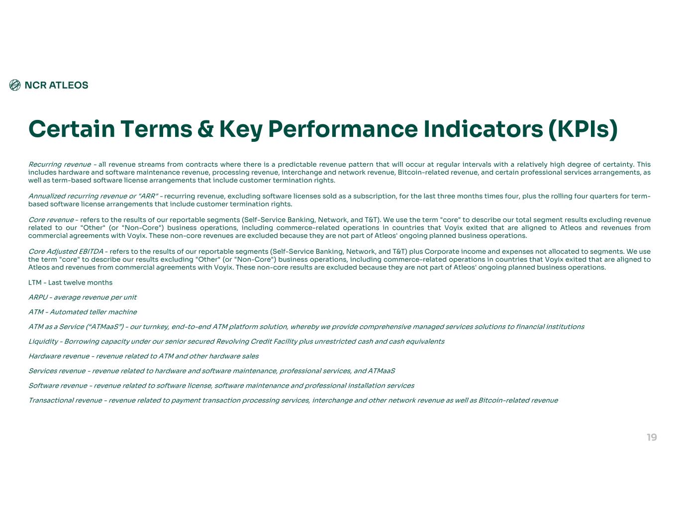 Recurring revenue - all revenue streams from contracts where there is a predictable revenue pattern that will occur at regular intervals with a relatively high degree of certainty. This includes hardware and software maintenance revenue, processing revenue, interchange and network revenue, Bitcoin-related revenue, and certain professional services arrangements, as well as term-based software license arrangements that include customer termination rights. Annualized recurring revenue or "ARR" - recurring revenue, excluding software licenses sold as a subscription, for the last three months times four, plus the rolling four quarters for term- based software license arrangements that include customer termination rights. Core revenue - refers to the results of our reportable segments (Self-Service Banking, Network, and T&T). We use the term "core" to describe our total segment results excluding revenue related to our "Other" (or "Non-Core") business operations, including commerce-related operations in countries that Voyix exited that are aligned to Atleos and revenues from commercial agreements with Voyix. These non-core revenues are excluded because they are not part of Atleos' ongoing planned business operations. Core Adjusted EBITDA - refers to the results of our reportable segments (Self-Service Banking, Network, and T&T) plus Corporate income and expenses not allocated to segments. We use the term "core" to describe our results excluding "Other" (or "Non-Core") business operations, including commerce-related operations in countries that Voyix exited that are aligned to Atleos and revenues from commercial agreements with Voyix. These non-core results are excluded because they are not part of Atleos' ongoing planned business operations. LTM - Last twelve months ARPU - average revenue per unit ATM - Automated teller machine ATM as a Service (“ATMaaS”) - our turnkey, end-to-end ATM platform solution, whereby we provide comprehensive managed services solutions to financial institutions Liquidity - Borrowing capacity under our senior secured Revolving Credit Facility plus unrestricted cash and cash equivalents Hardware revenue - revenue related to ATM and other hardware sales Services revenue - revenue related to hardware and software maintenance, professional services, and ATMaaS Software revenue - revenue related to software license, software maintenance and professional installation services Transactional revenue - revenue related to payment transaction processing services, interchange and other network revenue as well as Bitcoin-related revenue Certain Terms & Key Performance Indicators (KPIs) 19