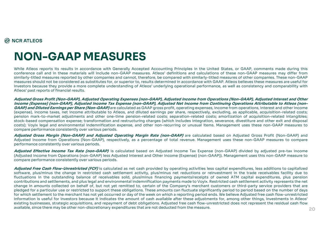 While Atleos reports its results in accordance with Generally Accepted Accounting Principles in the United States, or GAAP, comments made during this conference call and in these materials will include non-GAAP measures. Atleos’ definitions and calculations of these non-GAAP measures may differ from similarly-titled measures reported by other companies and cannot, therefore, be compared with similarly-titled measures of other companies. These non-GAAP measures should not be considered as substitutes for, or superior to, results determined in accordance with GAAP. Atleos believes these measures are useful for investors because they provide a more complete understanding of Atleos’ underlying operational performance, as well as consistency and comparability with Atleos’ past reports of financial results. Adjusted Gross Profit (Non-GAAP), Adjusted Operating Expenses (non-GAAP), Adjusted Income from Operations (Non-GAAP), Adjusted Interest and Other Income (Expense) (non-GAAP), Adjusted Income Tax Expense (non-GAAP), Adjusted Net Income from Continuing Operations Attributable to Atleos (non- GAAP) and Diluted Earnings per Share (Non-GAAP) are calculated as GAAP gross profit, operating expenses, income from operations, interest and other income (expense), income taxes, net income attributable to Atleos, and diluted earnings per share, respectively, excluding, as applicable, acquisition-related costs; pension mark-to-market adjustments and other one-time pension-related costs; separation-related costs; amortization of acquisition-related intangibles; stock-based compensation expense; transformation and restructuring charges (which includes integration, severance, divestiture and other exit and disposal costs); Voyix legal and environmental indemnification expense, and other non-recurring or unusual items. Management uses these non-GAAP measures to compare performance consistently over various periods. Adjusted Gross Margin (Non-GAAP) and Adjusted Operating Margin Rate (non-GAAP) are calculated based on Adjusted Gross Profit (Non-GAAP) and Adjusted Income from Operations (Non-GAAP), respectively, as a percentage of total revenue. Management uses these non-GAAP measures to compare performance consistently over various periods. Adjusted Effective Income Tax Rate (non-GAAP) is calculated based on Adjusted Income Tax Expense (non-GAAP) divided by adjusted pre-tax income (Adjusted Income from Operations (non-GAAP) less Adjusted Interest and Other Income (Expense) (non-GAAP)). Management uses this non-GAAP measure to compare performance consistently over various periods. Adjusted Free Cash Flow-Unrestricted (FCF) is calculated as net cash provided by operating activities less capital expenditures, less additions to capitalized software, plus/minus the change in restricted cash settlement activity, plus/minus net reductions or reinvestment in the trade receivables facility due to fluctuations in the outstanding balance of receivables sold, plus/minus financing payments/receipts of owned ATM capital expenditures, plus pension contributions and settlements, and plus legal and environmental indemnification payments made to Voyix. Restricted cash settlement activity represents the net change in amounts collected on behalf of, but not yet remitted to, certain of the Company’s merchant customers or third-party service providers that are pledged for a particular use or restricted to support these obligations. These amounts can fluctuate significantly period to period based on the number of days for which settlement to the merchant has not yet occurred or day of the week on which a reporting period ends. We believe Adjusted free cash flow-unrestricted information is useful for investors because it indicates the amount of cash available after these adjustments for, among other things, investments in Atleos’ existing businesses, strategic acquisitions, and repayment of debt obligations. Adjusted free cash flow-unrestricted does not represent the residual cash flow available, since there may be other non-discretionary expenditures that are not deducted from the measure. NON-GAAP MEASURES 20
