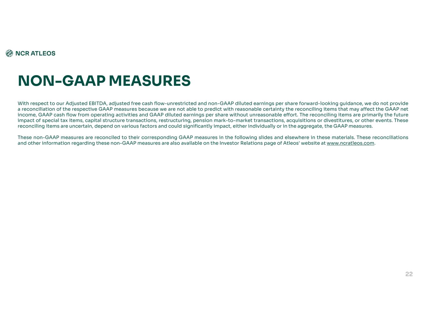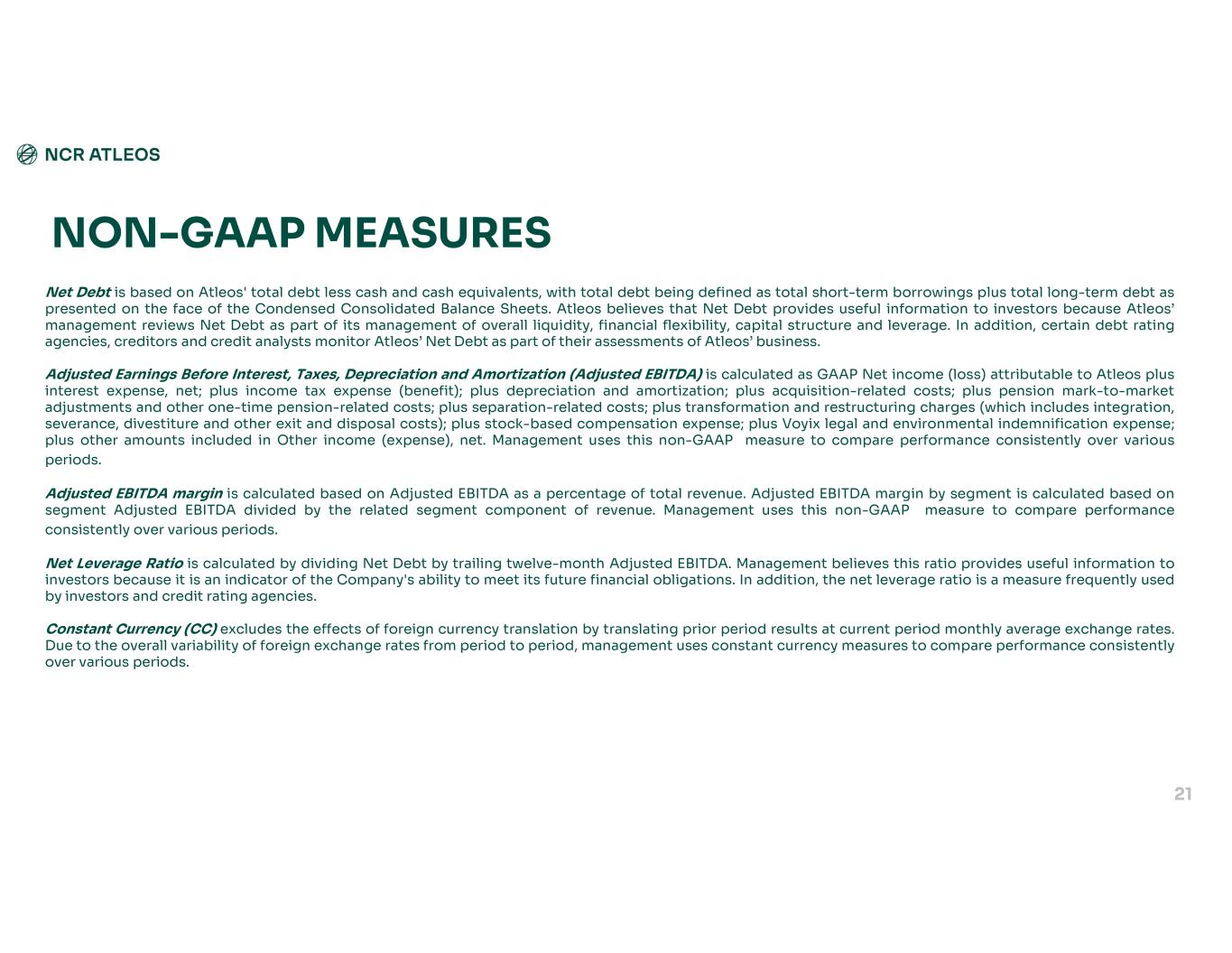 Net Debt is based on Atleos' total debt less cash and cash equivalents, with total debt being defined as total short-term borrowings plus total long-term debt as presented on the face of the Condensed Consolidated Balance Sheets. Atleos believes that Net Debt provides useful information to investors because Atleos’ management reviews Net Debt as part of its management of overall liquidity, financial flexibility, capital structure and leverage. In addition, certain debt rating agencies, creditors and credit analysts monitor Atleos’ Net Debt as part of their assessments of Atleos’ business. Adjusted Earnings Before Interest, Taxes, Depreciation and Amortization (Adjusted EBITDA) is calculated as GAAP Net income (loss) attributable to Atleos plus interest expense, net; plus income tax expense (benefit); plus depreciation and amortization; plus acquisition-related costs; plus pension mark-to-market adjustments and other one-time pension-related costs; plus separation-related costs; plus transformation and restructuring charges (which includes integration, severance, divestiture and other exit and disposal costs); plus stock-based compensation expense; plus Voyix legal and environmental indemnification expense; plus other amounts included in Other income (expense), net. Management uses this non-GAAP measure to compare performance consistently over various periods. Adjusted EBITDA margin is calculated based on Adjusted EBITDA as a percentage of total revenue. Adjusted EBITDA margin by segment is calculated based on segment Adjusted EBITDA divided by the related segment component of revenue. Management uses this non-GAAP measure to compare performance consistently over various periods. Net Leverage Ratio is calculated by dividing Net Debt by trailing twelve-month Adjusted EBITDA. Management believes this ratio provides useful information to investors because it is an indicator of the Company's ability to meet its future financial obligations. In addition, the net leverage ratio is a measure frequently used by investors and credit rating agencies. Constant Currency (CC) excludes the effects of foreign currency translation by translating prior period results at current period monthly average exchange rates. Due to the overall variability of foreign exchange rates from period to period, management uses constant currency measures to compare performance consistently over various periods. NON-GAAP MEASURES 21