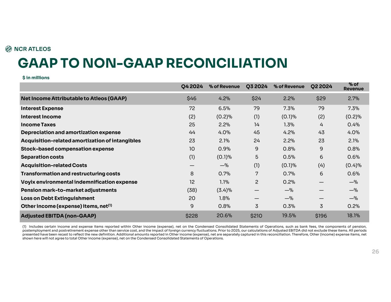 % of RevenueQ1 2024% of RevenueQ1 2025 (0.8)%$(8)1.7%$17Net Income (loss) Attributable to Atleos (GAAP) 7.5%796.9%67Interest Expense (0.2)%(2)(0.1)%(1)Interest Income 0.4%41.0%10Income Taxes 4.2%444.3%42Depreciation and amortization 2.3%252.3%23Acquisition-related amortization of intangibles 1.0%100.9%9Stock-based compensation expense 0.9%90.3%2Separation costs 0.1%10.1%1Transformation & restructuring costs — %—0.4%4Voyix environmental indemnification expense (0.2)%(2)0.1%1Other (income) expense items, net(1) 15.2%$16017.9%$175Adjusted EBITDA (non-GAAP) (4)(2)Other (Voyix-related) income and expenses not allocated to segments $156$173Core Adjusted EBITDA (non-GAAP) GAAP TO NON-GAAP RECONCILIATION $ in millions 25 (1) Includes certain income and expense items reported within Other income (expense), net on the Condensed Consolidated Statements of Operations, such as bank fees, the components of pension, postemployment and postretirement expense other than service cost, and the impact of foreign currency fluctuations. Prior to 2025, our calculations of Adjusted EBITDA did not exclude these items. All periods presented have been recast to reflect the new definition. Additional amounts reported in Other income (expense), net are separately captured in this reconciliation. Therefore, Other (income) expense items, net shown here will not agree to total Other income (expense), net on the Condensed Consolidated Statements of Operations.