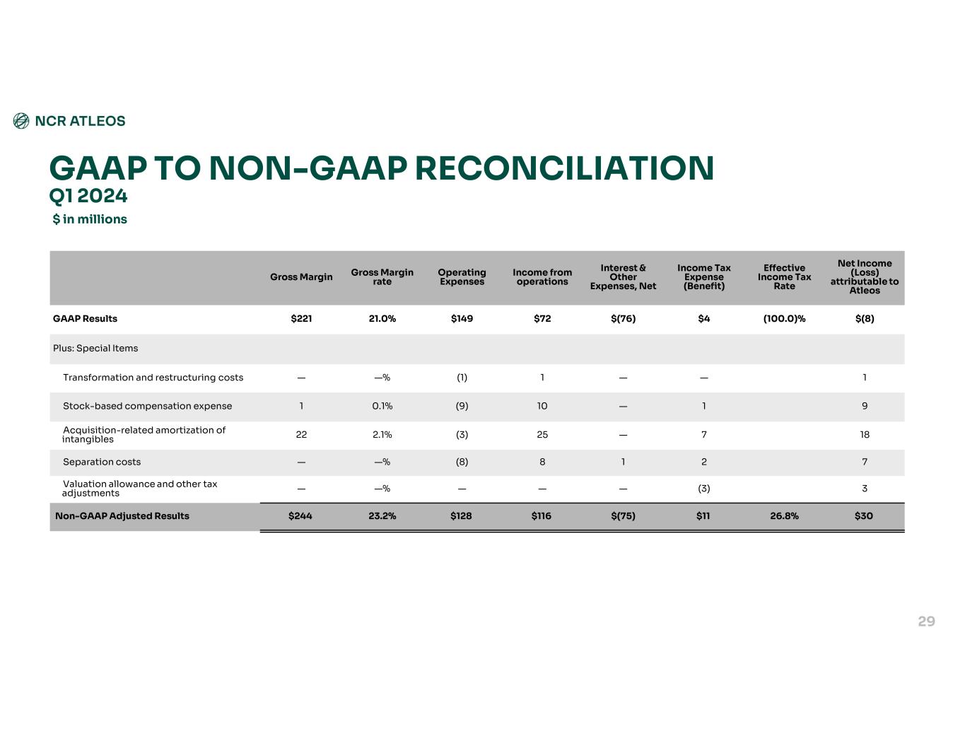 GAAP TO NON-GAAP RECONCILIATION $ in millions Net Income (Loss) attributable to Atleos Effective Income Tax Rate Income Tax Expense (Benefit) Interest & Other Expenses, Net Income from operations Operating Expenses Gross Margin rateGross Margin $(8)(100.0)%$4$(76)$72$14921.0%$221GAAP Results Plus: Special Items 1——1(1)—%—Transformation and restructuring costs 91—10(9)0.1%1Stock-based compensation expense 187—25(3)2.1%22Acquisition-related amortization of intangibles 7218(8)—%—Separation costs 3(3)————%—Valuation allowance and other tax adjustments $3026.8%$11$(75)$116$12823.2%$244Non-GAAP Adjusted Results Q1 2024 29