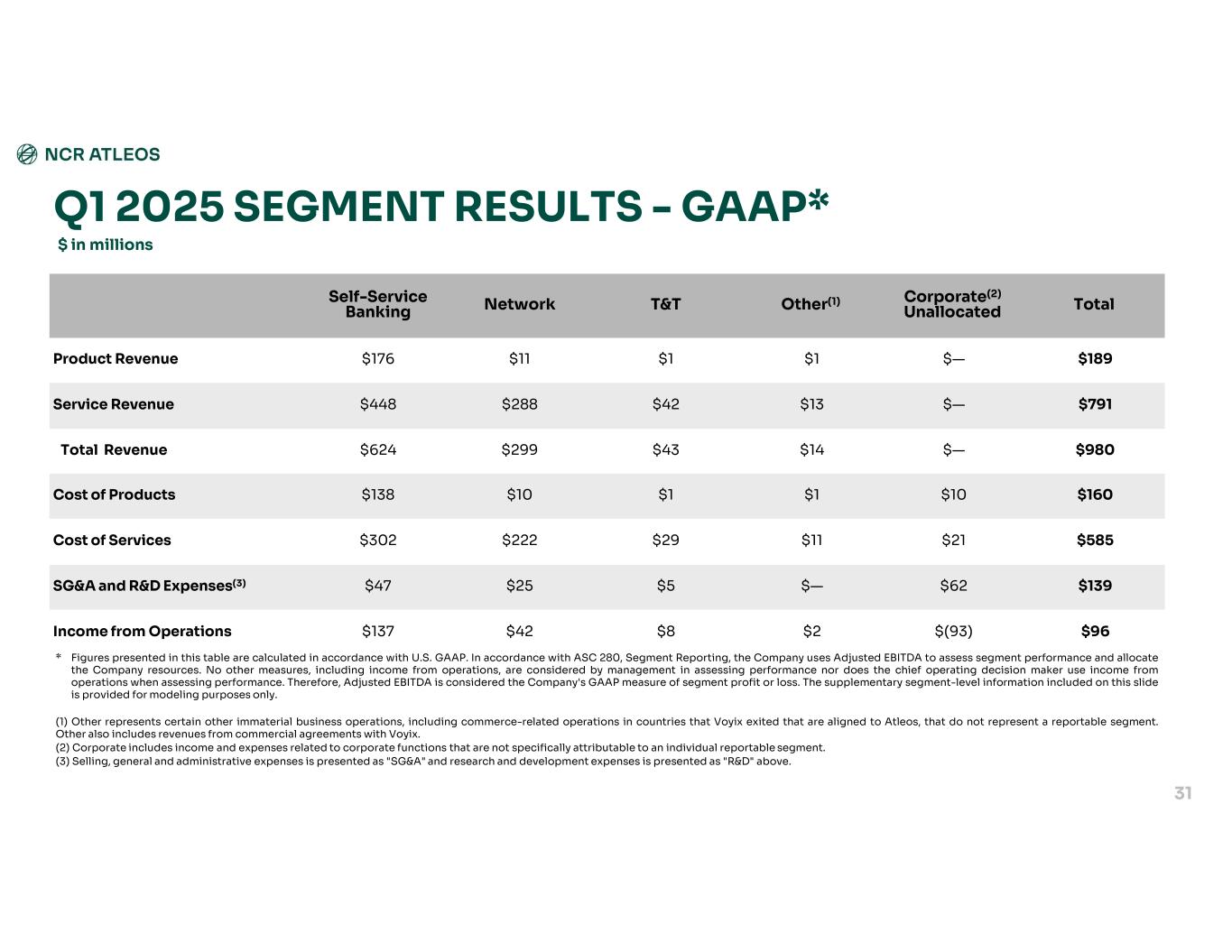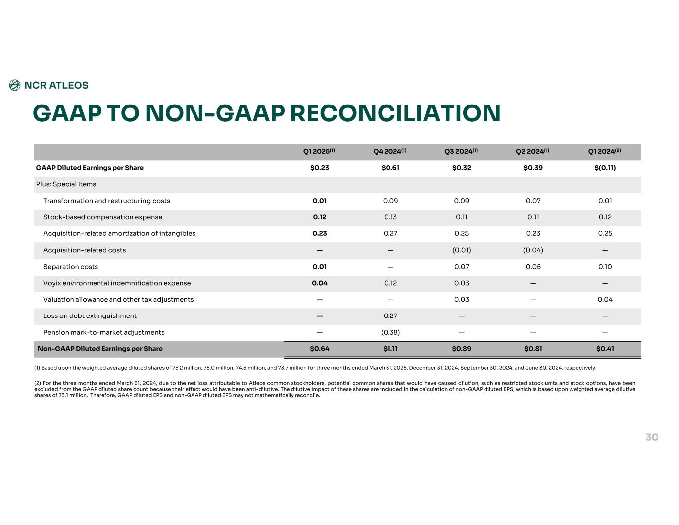 GAAP TO NON-GAAP RECONCILIATION Q1 2024(2)Q2 2024(1)Q3 2024(1)Q4 2024(1)Q1 2025(1) $(0.11)$0.39$0.32$0.61$0.23GAAP Diluted Earnings per Share Plus: Special Items 0.010.070.090.090.01Transformation and restructuring costs 0.120.110.110.130.12Stock-based compensation expense 0.250.230.250.270.23Acquisition-related amortization of intangibles —(0.04)(0.01)——Acquisition-related costs 0.100.050.07—0.01Separation costs ——0.030.120.04Voyix environmental indemnification expense 0.04—0.03——Valuation allowance and other tax adjustments ———0.27—Loss on debt extinguishment ———(0.38)—Pension mark-to-market adjustments $0.41$0.81$0.89$1.11$0.64Non-GAAP Diluted Earnings per Share 30 (1) Based upon the weighted average diluted shares of 75.2 million, 75.0 million, 74.5 million, and 73.7 million for three months ended March 31, 2025, December 31, 2024, September 30, 2024, and June 30, 2024, respectively. (2) For the three months ended March 31, 2024, due to the net loss attributable to Atleos common stockholders, potential common shares that would have caused dilution, such as restricted stock units and stock options, have been excluded from the GAAP diluted share count because their effect would have been anti-dilutive. The dilutive impact of these shares are included in the calculation of non-GAAP diluted EPS, which is based upon weighted average dilutive shares of 73.1 million. Therefore, GAAP diluted EPS and non-GAAP diluted EPS may not mathematically reconcile.