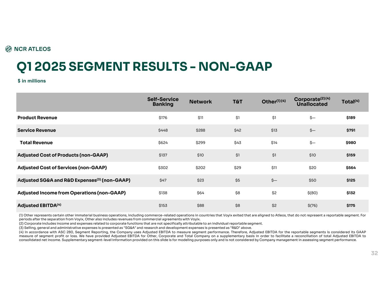 * Figures presented in this table are calculated in accordance with U.S. GAAP. In accordance with ASC 280, Segment Reporting, the Company uses Adjusted EBITDA to assess segment performance and allocate the Company resources. No other measures, including income from operations, are considered by management in assessing performance nor does the chief operating decision maker use income from operations when assessing performance. Therefore, Adjusted EBITDA is considered the Company's GAAP measure of segment profit or loss. The supplementary segment-level information included on this slide is provided for modeling purposes only. (1) Other represents certain other immaterial business operations, including commerce-related operations in countries that Voyix exited that are aligned to Atleos, that do not represent a reportable segment. Other also includes revenues from commercial agreements with Voyix. (2) Corporate includes income and expenses related to corporate functions that are not specifically attributable to an individual reportable segment. (3) Selling, general and administrative expenses is presented as "SG&A" and research and development expenses is presented as "R&D" above. TotalCorporate(2) UnallocatedOther(1)T&TNetworkSelf-Service Banking $189$—$1$1$11$176Product Revenue $791$—$13$42$288$448Service Revenue $980$—$14$43$299$624Total Revenue $160$10$1$1$10$138Cost of Products $585$21$11$29$222$302Cost of Services $139$62$—$5$25$47SG&A and R&D Expenses(3) $96$(93)$2$8$42$137Income from Operations Q1 2025 SEGMENT RESULTS - GAAP* $ in millions 31
