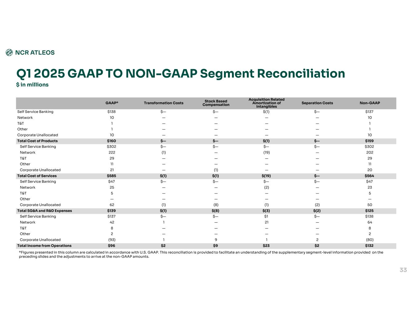 Total(4)Corporate(2) (4) UnallocatedOther(1) (4)T&TNetworkSelf-Service Banking $189$—$1$1$11$176Product Revenue $791$—$13$42$288$448Service Revenue $980$—$14$43$299$624Total Revenue $159$10$1$1$10$137Adjusted Cost of Products (non-GAAP) $564$20$11$29$202$302Adjusted Cost of Services (non-GAAP) $125$50$—$5$23$47Adjusted SG&A and R&D Expenses(3) (non-GAAP) $132$(80)$2$8$64$138Adjusted Income from Operations (non-GAAP) $175$(76)$2$8$88$153Adjusted EBITDA(4) Q1 2025 SEGMENT RESULTS - NON-GAAP $ in millions 32 (1) Other represents certain other immaterial business operations, including commerce-related operations in countries that Voyix exited that are aligned to Atleos, that do not represent a reportable segment. For periods after the separation from Voyix, Other also includes revenues from commercial agreements with Voyix. (2) Corporate includes income and expenses related to corporate functions that are not specifically attributable to an individual reportable segment. (3) Selling, general and administrative expenses is presented as "SG&A" and research and development expenses is presented as "R&D" above. (4) In accordance with ASC 280, Segment Reporting, the Company uses Adjusted EBITDA to measure segment performance. Therefore, Adjusted EBITDA for the reportable segments is considered its GAAP measure of segment profit or loss. We have provided Adjusted EBITDA for Other, Corporate and Total Company on a supplementary basis in order to facilitate a reconciliation of total Adjusted EBITDA to consolidated net income. Supplementary segment-level information provided on this slide is for modeling purposes only and is not considered by Company management in assessing segment performance.