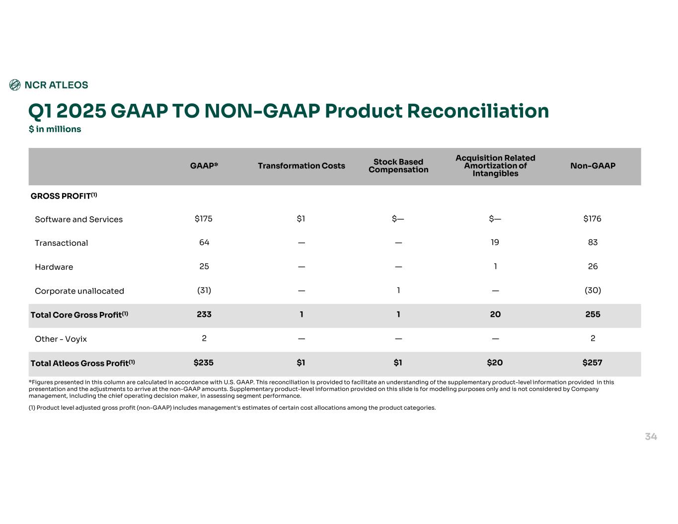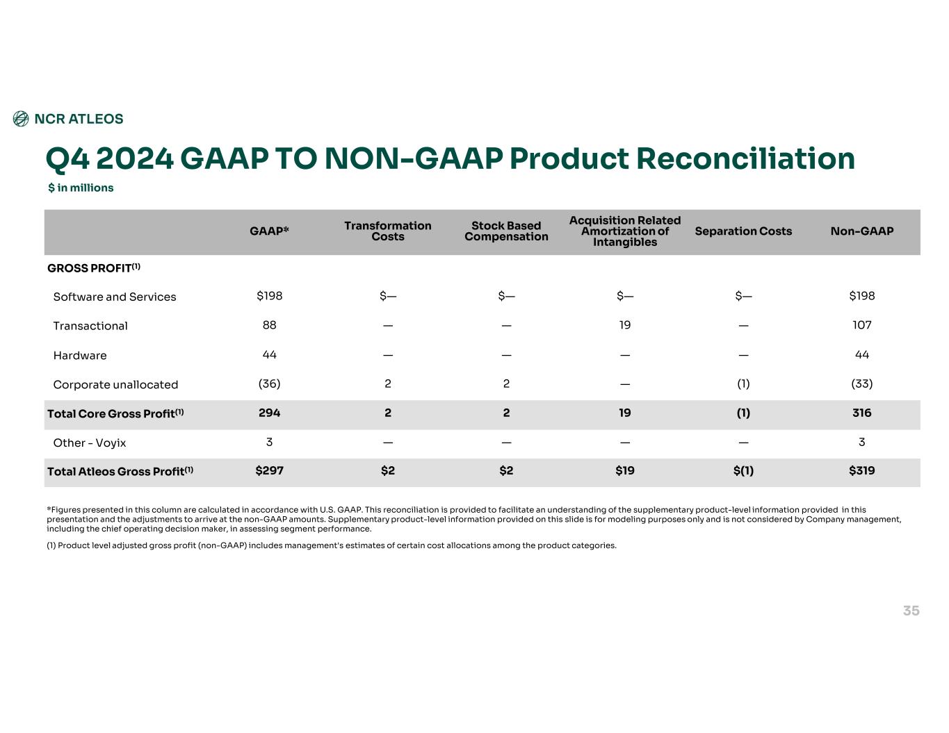 Non-GAAP Acquisition Related Amortization of Intangibles Stock Based CompensationTransformation CostsGAAP* GROSS PROFIT(1) $176$—$—$1$175Software and Services 8319——64Transactional 261——25Hardware (30)—1—(31)Corporate unallocated 2552011233Total Core Gross Profit(1) 2———2Other - Voyix $257$20$1$1$235Total Atleos Gross Profit(1) Q1 2025 GAAP TO NON-GAAP Product Reconciliation $ in millions 34 *Figures presented in this column are calculated in accordance with U.S. GAAP. This reconciliation is provided to facilitate an understanding of the supplementary product-level information provided in this presentation and the adjustments to arrive at the non-GAAP amounts. Supplementary product-level information provided on this slide is for modeling purposes only and is not considered by Company management, including the chief operating decision maker, in assessing segment performance. (1) Product level adjusted gross profit (non-GAAP) includes management's estimates of certain cost allocations among the product categories.