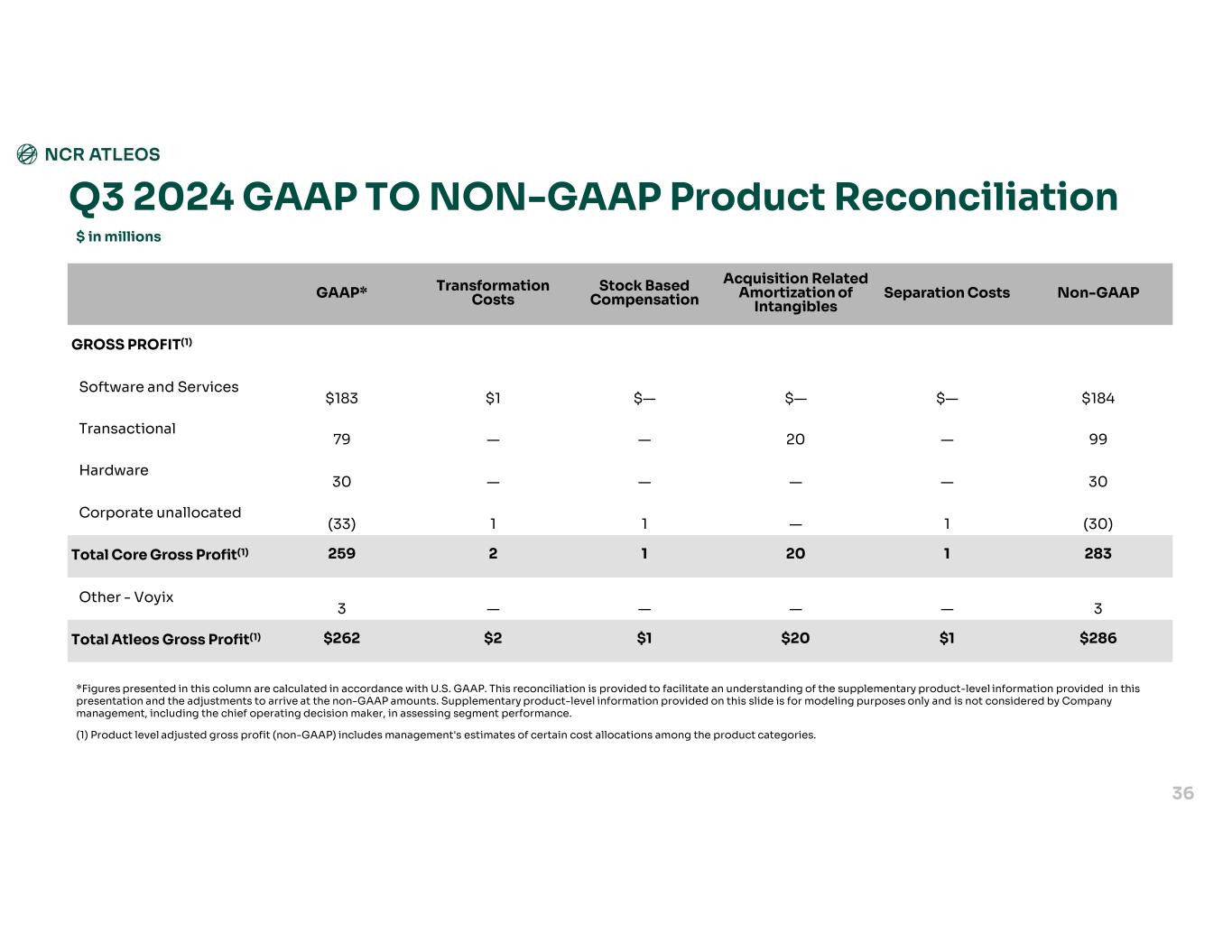 Non-GAAPSeparation Costs Acquisition Related Amortization of Intangibles Stock Based Compensation Transformation CostsGAAP* GROSS PROFIT(1) $198$—$—$—$—$198Software and Services 107—19——88Transactional 44————44Hardware (33)(1)—22(36)Corporate unallocated 316(1)1922294Total Core Gross Profit(1) 3————3Other - Voyix $319$(1)$19$2$2$297Total Atleos Gross Profit(1) Q4 2024 GAAP TO NON-GAAP Product Reconciliation $ in millions 35 *Figures presented in this column are calculated in accordance with U.S. GAAP. This reconciliation is provided to facilitate an understanding of the supplementary product-level information provided in this presentation and the adjustments to arrive at the non-GAAP amounts. Supplementary product-level information provided on this slide is for modeling purposes only and is not considered by Company management, including the chief operating decision maker, in assessing segment performance. (1) Product level adjusted gross profit (non-GAAP) includes management's estimates of certain cost allocations among the product categories.