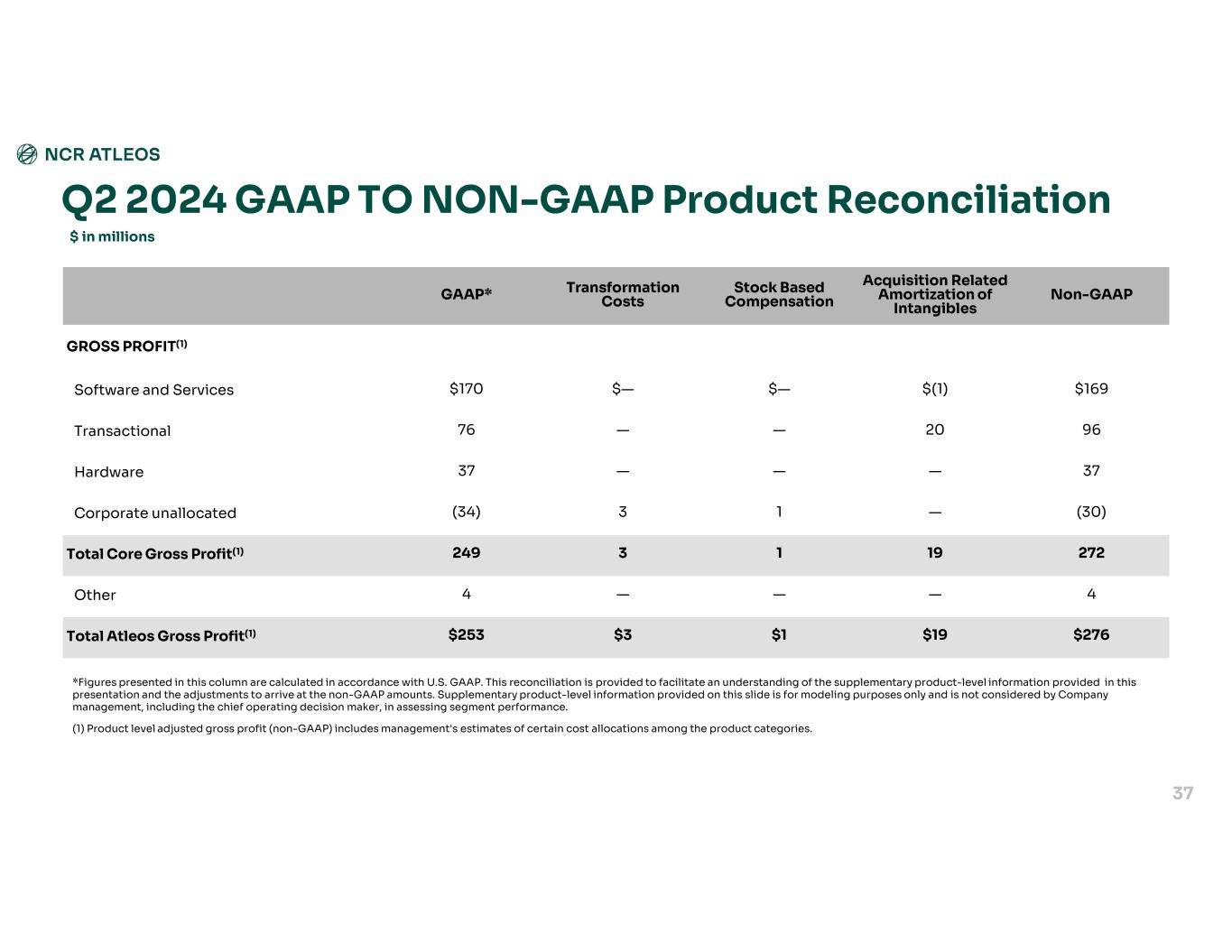 Non-GAAPSeparation Costs Acquisition Related Amortization of Intangibles Stock Based Compensation Transformation CostsGAAP* GROSS PROFIT(1) $184$—$—$—$1$183 Software and Services 99—20——79 Transactional 30————30 Hardware (30)1—11(33) Corporate unallocated 28312012259Total Core Gross Profit(1) 3————3 Other - Voyix $286$1$20$1$2$262Total Atleos Gross Profit(1) Q3 2024 GAAP TO NON-GAAP Product Reconciliation $ in millions 36 *Figures presented in this column are calculated in accordance with U.S. GAAP. This reconciliation is provided to facilitate an understanding of the supplementary product-level information provided in this presentation and the adjustments to arrive at the non-GAAP amounts. Supplementary product-level information provided on this slide is for modeling purposes only and is not considered by Company management, including the chief operating decision maker, in assessing segment performance. (1) Product level adjusted gross profit (non-GAAP) includes management's estimates of certain cost allocations among the product categories.