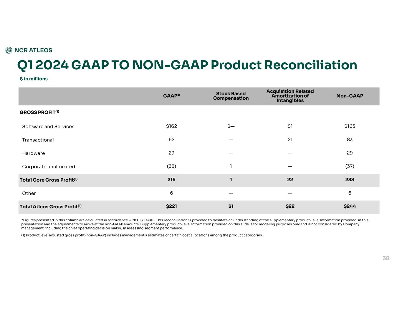 Non-GAAP Acquisition Related Amortization of Intangibles Stock Based Compensation Transformation CostsGAAP* GROSS PROFIT(1) $169$(1)$—$—$170Software and Services 9620——76Transactional 37———37Hardware (30)—13(34)Corporate unallocated 2721913249Total Core Gross Profit(1) 4———4Other $276$19$1$3$253Total Atleos Gross Profit(1) Q2 2024 GAAP TO NON-GAAP Product Reconciliation $ in millions 37 *Figures presented in this column are calculated in accordance with U.S. GAAP. This reconciliation is provided to facilitate an understanding of the supplementary product-level information provided in this presentation and the adjustments to arrive at the non-GAAP amounts. Supplementary product-level information provided on this slide is for modeling purposes only and is not considered by Company management, including the chief operating decision maker, in assessing segment performance. (1) Product level adjusted gross profit (non-GAAP) includes management's estimates of certain cost allocations among the product categories.