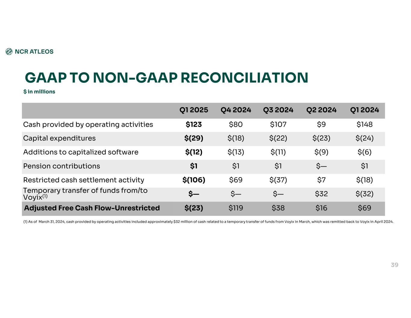 Q1 2024Q2 2024Q3 2024Q4 2024Q1 2025 $148$9$107$80$123Cash provided by operating activities $(24)$(23)$(22)$(18)$(29)Capital expenditures $(6)$(9)$(11)$(13)$(12)Additions to capitalized software $1$—$1$1$1Pension contributions $(18)$7$(37)$69$(106)Restricted cash settlement activity $(32)$32$—$—$—Temporary transfer of funds from/to Voyix(1) $69$16$38$119$(23)Adjusted Free Cash Flow-Unrestricted $ in millions GAAP TO NON-GAAP RECONCILIATION 39 (1) As of March 31, 2024, cash provided by operating activities included approximately $32 million of cash related to a temporary transfer of funds from Voyix in March, which was remitted back to Voyix in April 2024.