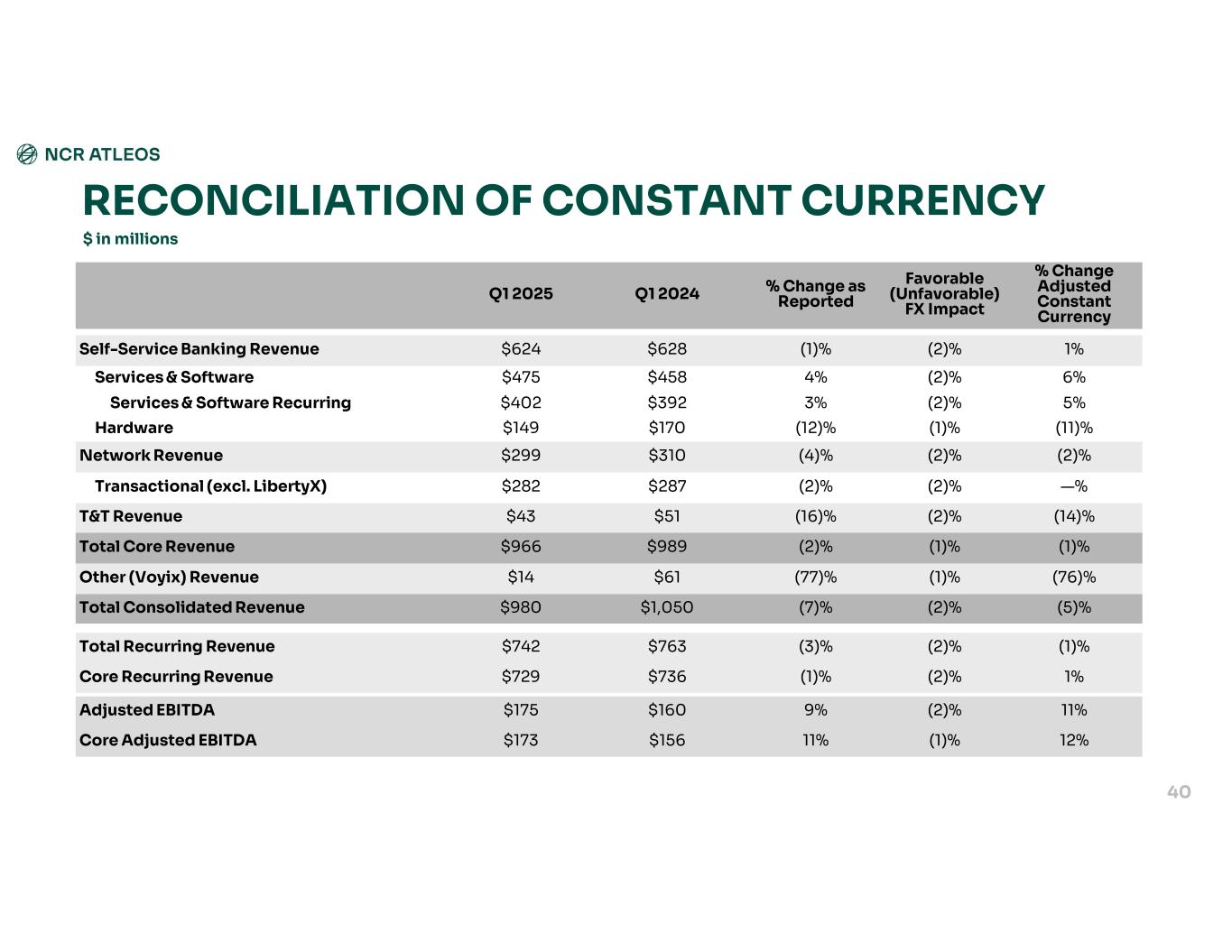 % Change Adjusted Constant Currency Favorable (Unfavorable) FX Impact % Change as ReportedQ1 2024Q1 2025 1%(2)%(1)%$628$624Self-Service Banking Revenue 6%(2)%4%$458$475Services & Software 5%(2)%3%$392$402Services & Software Recurring (11)%(1)%(12)%$170$149Hardware (2)%(2)%(4)%$310$299Network Revenue —%(2)%(2)%$287$282Transactional (excl. LibertyX) (14)%(2)%(16)%$51$43T&T Revenue (1)%(1)%(2)%$989$966Total Core Revenue (76)%(1)%(77)%$61$14Other (Voyix) Revenue (5)%(2)%(7)%$1,050$980Total Consolidated Revenue (1)%(2)%(3)%$763$742Total Recurring Revenue 1%(2)%(1)%$736$729Core Recurring Revenue 11%(2)%9%$160$175Adjusted EBITDA 12%(1)%11%$156$173Core Adjusted EBITDA RECONCILIATION OF CONSTANT CURRENCY 40 $ in millions