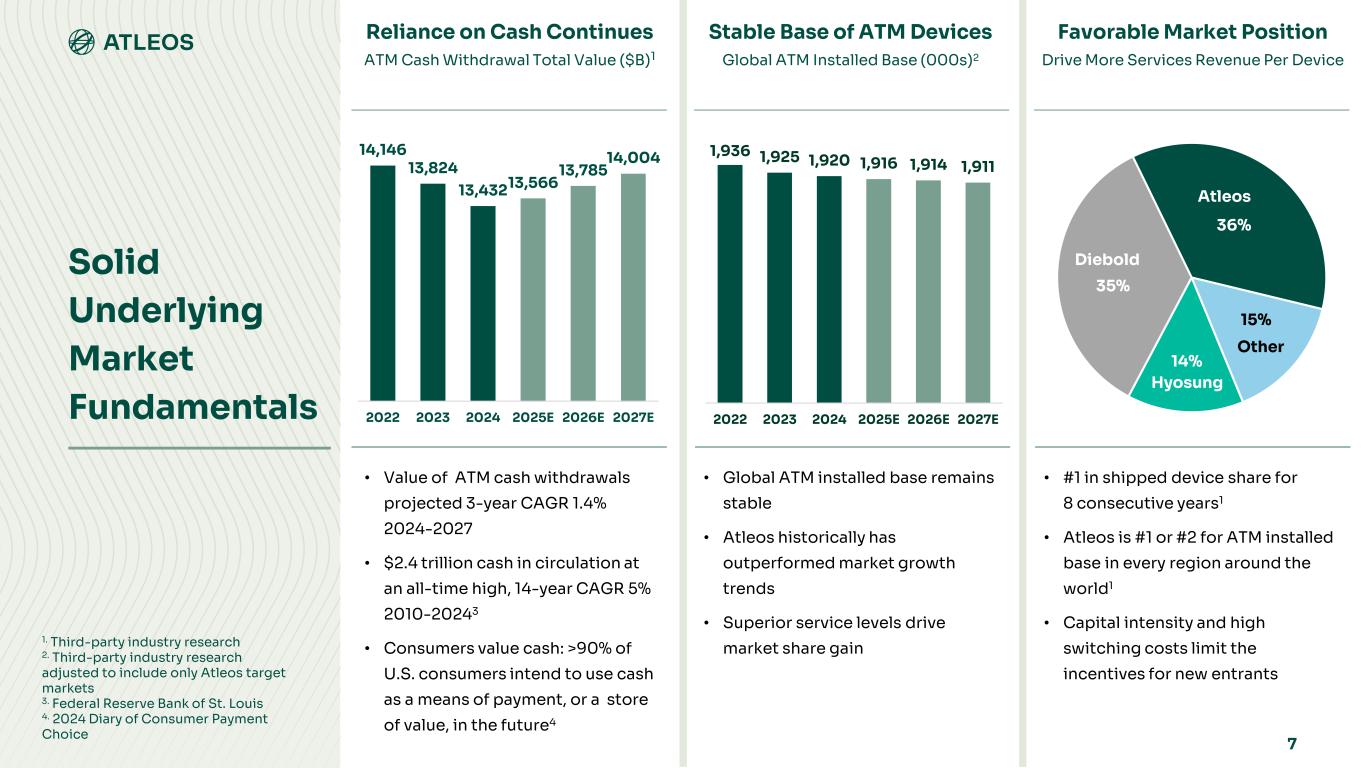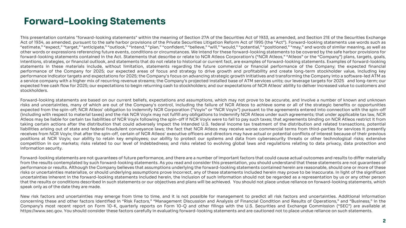 2 This presentation contains "forward-looking statements" within the meaning of Section 27A of the Securities Act of 1933, as amended, and Section 21E of the Securities Exchange Act of 1934, as amended, pursuant to the safe harbor provisions of the Private Securities Litigation Reform Act of 1995 (the “Act”). Forward-looking statements use words such as “estimate,” “expect,” “target,” “anticipate,” “outlook,” “intend,” “plan,” “confident,” “believe,” “will,” “would,” “potential,” “positioned,” “may,” and words of similar meaning, as well as other words or expressions referencing future events, conditions or circumstances. We intend for these forward-looking statements to be covered by the safe harbor provisions for forward-looking statements contained in the Act. Statements that describe or relate to NCR Atleos Corporation’s (“NCR Atleos,” “Atleos” or the “Company”) plans, targets, goals, intentions, strategies, or financial outlook, and statements that do not relate to historical or current fact, are examples of forward-looking statements. Examples of forward-looking statements in these materials include, without limitation, statements regarding the future commercial or financial performance of the Company; the expected financial performance of the Company for 2025; our expected areas of focus and strategy to drive growth and profitability and create long-term stockholder value, including key performance indicator targets and expectations for 2025; the Company's focus on advancing strategic growth initiatives and transforming the Company into a software-led ATM as a service company with a higher mix of recurring revenue streams; the Company’s projected installed base of ATM services units; our leverage targets for 2025 and long-term; our expected free cash flow for 2025; our expectations to begin returning cash to stockholders; and our expectations of NCR Atleos' ability to deliver increased value to customers and stockholders. Forward-looking statements are based on our current beliefs, expectations and assumptions, which may not prove to be accurate, and involve a number of known and unknown risks and uncertainties, many of which are out of the Company's control, including the failure of NCR Atleos to achieve some or all of the strategic benefits or opportunities expected from the spin-off; NCR Atleos' obligation to indemnify NCR Corporation (“Voyix” or “NCR Voyix”) pursuant to the agreements entered into connection with the spin-off (including with respect to material taxes) and the risk NCR Voyix may not fulfill any obligations to indemnify NCR Atleos under such agreements; that under applicable tax law, NCR Atleos may be liable for certain tax liabilities of NCR Voyix following the spin-off if NCR Voyix were to fail to pay such taxes; that agreements binding on NCR Atleos restrict it from taking certain actions after the distribution that could adversely impact the intended U.S. federal income tax treatment of the distribution and related transactions, potential liabilities arising out of state and federal fraudulent conveyance laws; the fact that NCR Atleos may receive worse commercial terms from third-parties for services it presently receives from NCR Voyix; that after the spin-off, certain of NCR Atleos' executive officers and directors may have actual or potential conflicts of interest because of their previous positions at NCR Voyix; our ability to retain key employees; our ability to protect our systems and data from cybersecurity threats or other technological risks; extensive competition in our markets; risks related to our level of indebtedness; and risks related to evolving global laws and regulations relating to data privacy, data protection and information security. Forward-looking statements are not guarantees of future performance, and there are a number of important factors that could cause actual outcomes and results to differ materially from the results contemplated by such forward-looking statements. As you read and consider this presentation, you should understand that these statements are not guarantees of performance or results. Although the Company believes that assumptions underlying the forward-looking statements contained herein are reasonable, should one or more of these risks or uncertainties materialize, or should underlying assumptions prove incorrect, any of these statements included herein may prove to be inaccurate. In light of the significant uncertainties inherent in the forward-looking statements included herein, the inclusion of such information should not be regarded as a representation by us or any other person that the results or conditions described in such statements or our objectives and plans will be achieved. You should not place undue reliance on forward-looking statements, which speak only as of the date they are made. New risk factors and uncertainties may emerge from time to time, and it is not possible for management to predict all risk factors and uncertainties. Additional information concerning these and other factors identified in “Risk Factors,” “Management Discussion and Analysis of Financial Condition and Results of Operations,” and “Business,” in the Company’s most recent report on Form 10-K, quarterly reports on Form 10-Q and other filings with the U.S. Securities and Exchange Commission (“SEC”) are available at https://www.sec.gov. You should consider these factors carefully in evaluating forward-looking statements and are cautioned not to place undue reliance on such statements. Forward-Looking Statements