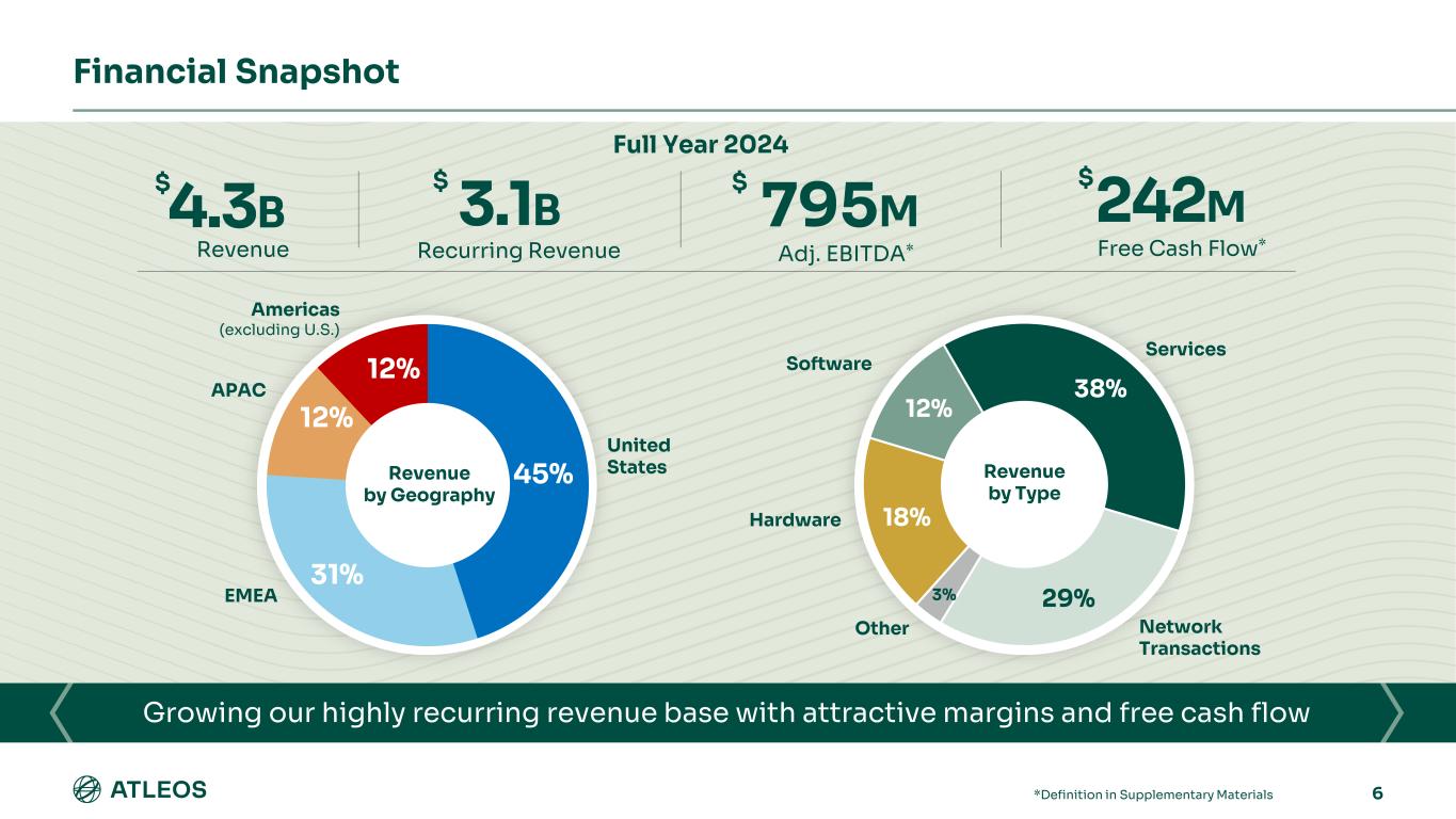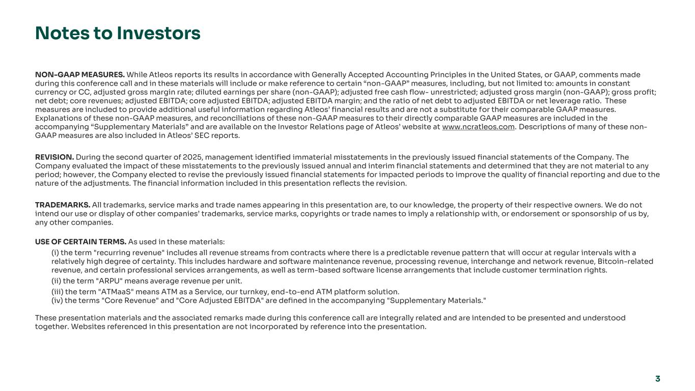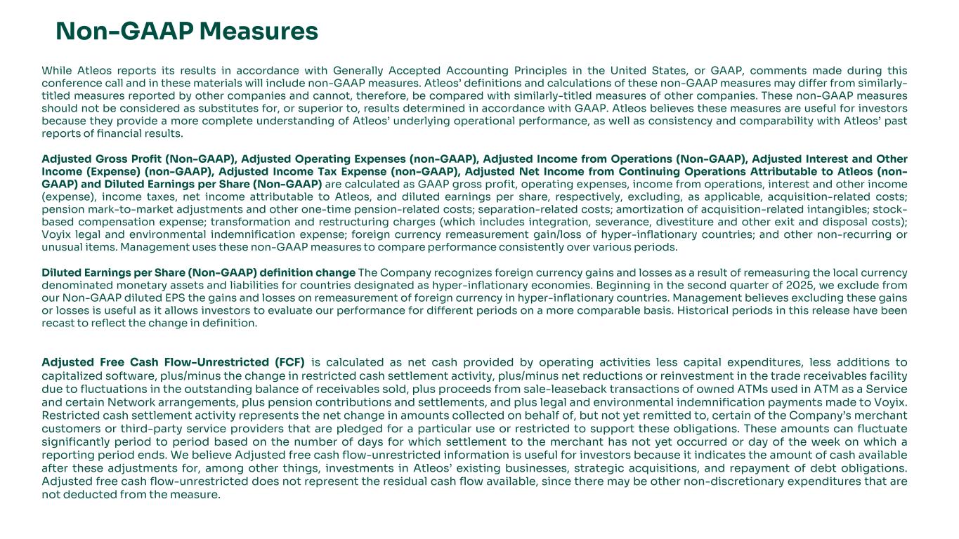 While Atleos reports its results in accordance with Generally Accepted Accounting Principles in the United States, or GAAP, comments made during this conference call and in these materials will include non-GAAP measures. Atleos’ definitions and calculations of these non-GAAP measures may differ from similarly- titled measures reported by other companies and cannot, therefore, be compared with similarly-titled measures of other companies. These non-GAAP measures should not be considered as substitutes for, or superior to, results determined in accordance with GAAP. Atleos believes these measures are useful for investors because they provide a more complete understanding of Atleos’ underlying operational performance, as well as consistency and comparability with Atleos’ past reports of financial results. Adjusted Gross Profit (Non-GAAP), Adjusted Operating Expenses (non-GAAP), Adjusted Income from Operations (Non-GAAP), Adjusted Interest and Other Income (Expense) (non-GAAP), Adjusted Income Tax Expense (non-GAAP), Adjusted Net Income from Continuing Operations Attributable to Atleos (non- GAAP) and Diluted Earnings per Share (Non-GAAP) are calculated as GAAP gross profit, operating expenses, income from operations, interest and other income (expense), income taxes, net income attributable to Atleos, and diluted earnings per share, respectively, excluding, as applicable, acquisition-related costs; pension mark-to-market adjustments and other one-time pension-related costs; separation-related costs; amortization of acquisition-related intangibles; stock- based compensation expense; transformation and restructuring charges (which includes integration, severance, divestiture and other exit and disposal costs); Voyix legal and environmental indemnification expense; foreign currency remeasurement gain/loss of hyper-inflationary countries; and other non-recurring or unusual items. Management uses these non-GAAP measures to compare performance consistently over various periods. Diluted Earnings per Share (Non-GAAP) definition change The Company recognizes foreign currency gains and losses as a result of remeasuring the local currency denominated monetary assets and liabilities for countries designated as hyper-inflationary economies. Beginning in the second quarter of 2025, we exclude from our Non-GAAP diluted EPS the gains and losses on remeasurement of foreign currency in hyper-inflationary countries. Management believes excluding these gains or losses is useful as it allows investors to evaluate our performance for different periods on a more comparable basis. Historical periods in this release have been recast to reflect the change in definition. Adjusted Free Cash Flow-Unrestricted (FCF) is calculated as net cash provided by operating activities less capital expenditures, less additions to capitalized software, plus/minus the change in restricted cash settlement activity, plus/minus net reductions or reinvestment in the trade receivables facility due to fluctuations in the outstanding balance of receivables sold, plus proceeds from sale-leaseback transactions of owned ATMs used in ATM as a Service and certain Network arrangements, plus pension contributions and settlements, and plus legal and environmental indemnification payments made to Voyix. Restricted cash settlement activity represents the net change in amounts collected on behalf of, but not yet remitted to, certain of the Company’s merchant customers or third-party service providers that are pledged for a particular use or restricted to support these obligations. These amounts can fluctuate significantly period to period based on the number of days for which settlement to the merchant has not yet occurred or day of the week on which a reporting period ends. We believe Adjusted free cash flow-unrestricted information is useful for investors because it indicates the amount of cash available after these adjustments for, among other things, investments in Atleos’ existing businesses, strategic acquisitions, and repayment of debt obligations. Adjusted free cash flow-unrestricted does not represent the residual cash flow available, since there may be other non-discretionary expenditures that are not deducted from the measure. Non-GAAP Measures
