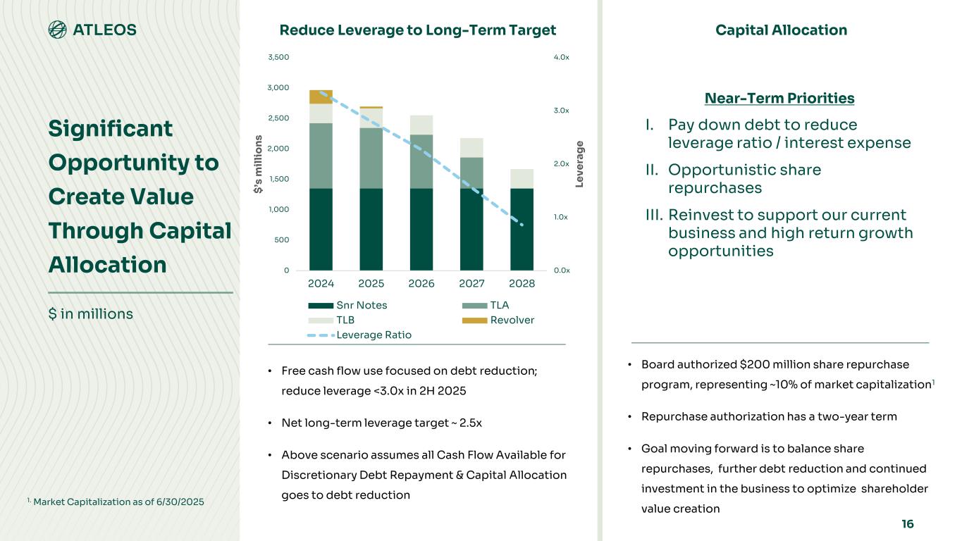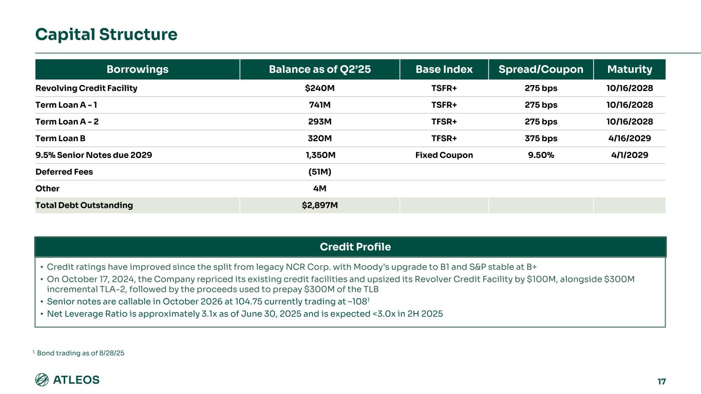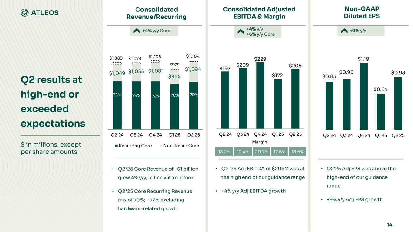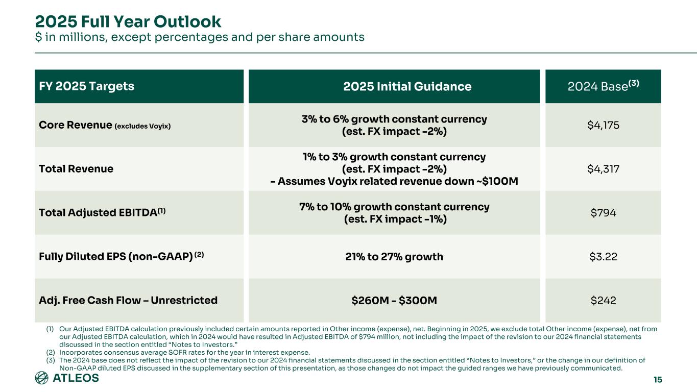While Atleos reports its results in accordance with Generally Accepted Accounting Principles in the United States, or GAAP, comments made during this conference call and in these materials will include non-GAAP measures. Atleos’ definitions and calculations of these non-GAAP measures may differ from similarly- titled measures reported by other companies and cannot, therefore, be compared with similarly-titled measures of other companies. These non-GAAP measures should not be considered as substitutes for, or superior to, results determined in accordance with GAAP. Atleos believes these measures are useful for investors because they provide a more complete understanding of Atleos’ underlying operational performance, as well as consistency and comparability with Atleos’ past reports of financial results. Adjusted Gross Profit (Non-GAAP), Adjusted Operating Expenses (non-GAAP), Adjusted Income from Operations (Non-GAAP), Adjusted Interest and Other Income (Expense) (non-GAAP), Adjusted Income Tax Expense (non-GAAP), Adjusted Net Income from Continuing Operations Attributable to Atleos (non- GAAP) and Diluted Earnings per Share (Non-GAAP) are calculated as GAAP gross profit, operating expenses, income from operations, interest and other income (expense), income taxes, net income attributable to Atleos, and diluted earnings per share, respectively, excluding, as applicable, acquisition-related costs; pension mark-to-market adjustments and other one-time pension-related costs; separation-related costs; amortization of acquisition-related intangibles; stock- based compensation expense; transformation and restructuring charges (which includes integration, severance, divestiture and other exit and disposal costs); Voyix legal and environmental indemnification expense; foreign currency remeasurement gain/loss of hyper-inflationary countries; and other non-recurring or unusual items. Management uses these non-GAAP measures to compare performance consistently over various periods. Diluted Earnings per Share (Non-GAAP) definition change The Company recognizes foreign currency gains and losses as a result of remeasuring the local currency denominated monetary assets and liabilities for countries designated as hyper-inflationary economies. Beginning in the second quarter of 2025, we exclude from our Non-GAAP diluted EPS the gains and losses on remeasurement of foreign currency in hyper-inflationary countries. Management believes excluding these gains or losses is useful as it allows investors to evaluate our performance for different periods on a more comparable basis. Historical periods in this release have been recast to reflect the change in definition. Adjusted Free Cash Flow-Unrestricted (FCF) is calculated as net cash provided by operating activities less capital expenditures, less additions to capitalized software, plus/minus the change in restricted cash settlement activity, plus/minus net reductions or reinvestment in the trade receivables facility due to fluctuations in the outstanding balance of receivables sold, plus proceeds from sale-leaseback transactions of owned ATMs used in ATM as a Service and certain Network arrangements, plus pension contributions and settlements, and plus legal and environmental indemnification payments made to Voyix. Restricted cash settlement activity represents the net change in amounts collected on behalf of, but not yet remitted to, certain of the Company’s merchant customers or third-party service providers that are pledged for a particular use or restricted to support these obligations. These amounts can fluctuate significantly period to period based on the number of days for which settlement to the merchant has not yet occurred or day of the week on which a reporting period ends. We believe Adjusted free cash flow-unrestricted information is useful for investors because it indicates the amount of cash available after these adjustments for, among other things, investments in Atleos’ existing businesses, strategic acquisitions, and repayment of debt obligations. Adjusted free cash flow-unrestricted does not represent the residual cash flow available, since there may be other non-discretionary expenditures that are not deducted from the measure. Non-GAAP Measures