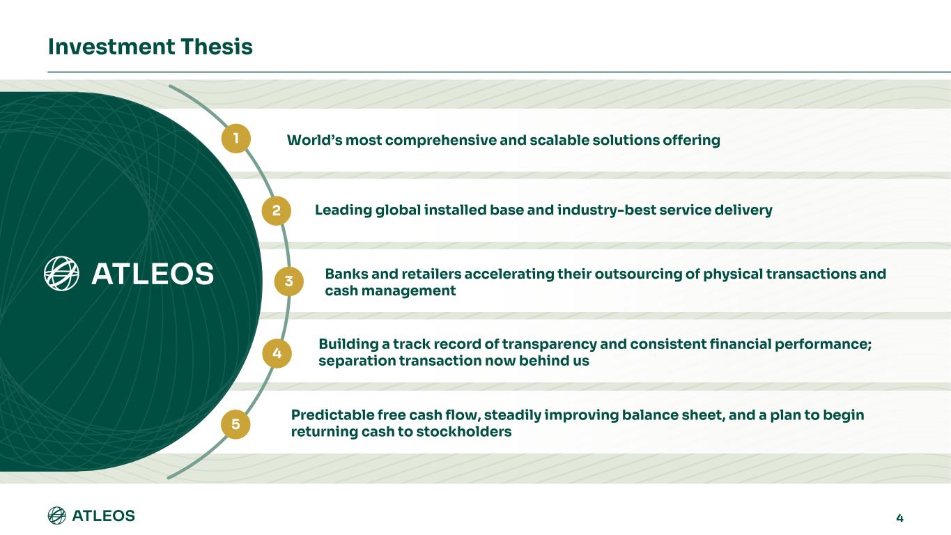 3 NON-GAAP MEASURES. While Atleos reports its results in accordance with Generally Accepted Accounting Principles in the United States, or GAAP, comments made during this conference call and in these materials will include or make reference to certain “non-GAAP” measures, including, but not limited to: amounts in constant currency or CC, adjusted gross margin rate; diluted earnings per share (non-GAAP); adjusted free cash flow- unrestricted; adjusted gross margin (non-GAAP); gross profit; net debt; core revenues; adjusted EBITDA; core adjusted EBITDA; adjusted EBITDA margin; and the ratio of net debt to adjusted EBITDA or net leverage ratio. These measures are included to provide additional useful information regarding Atleos’ financial results and are not a substitute for their comparable GAAP measures. Explanations of these non-GAAP measures, and reconciliations of these non-GAAP measures to their directly comparable GAAP measures are included in the accompanying “Supplementary Materials” and are available on the Investor Relations page of Atleos’ website at www.ncratleos.com. Descriptions of many of these non- GAAP measures are also included in Atleos’ SEC reports. REVISION. During the second quarter of 2025, management identified immaterial misstatements in the previously issued financial statements of the Company. The Company evaluated the impact of these misstatements to the previously issued annual and interim financial statements and determined that they are not material to any period; however, the Company elected to revise the previously issued financial statements for impacted periods to improve the quality of financial reporting and due to the nature of the adjustments. The financial information included in this presentation reflects the revision. TRADEMARKS. All trademarks, service marks and trade names appearing in this presentation are, to our knowledge, the property of their respective owners. We do not intend our use or display of other companies’ trademarks, service marks, copyrights or trade names to imply a relationship with, or endorsement or sponsorship of us by, any other companies. USE OF CERTAIN TERMS. As used in these materials: (i) the term "recurring revenue" includes all revenue streams from contracts where there is a predictable revenue pattern that will occur at regular intervals with a relatively high degree of certainty. This includes hardware and software maintenance revenue, processing revenue, interchange and network revenue, Bitcoin-related revenue, and certain professional services arrangements, as well as term-based software license arrangements that include customer termination rights. (ii) the term "ARPU" means average revenue per unit. (iii) the term "ATMaaS" means ATM as a Service, our turnkey, end-to-end ATM platform solution. (iv) the terms "Core Revenue" and "Core Adjusted EBITDA" are defined in the accompanying "Supplementary Materials." These presentation materials and the associated remarks made during this conference call are integrally related and are intended to be presented and understood together. Websites referenced in this presentation are not incorporated by reference into the presentation. Notes to Investors