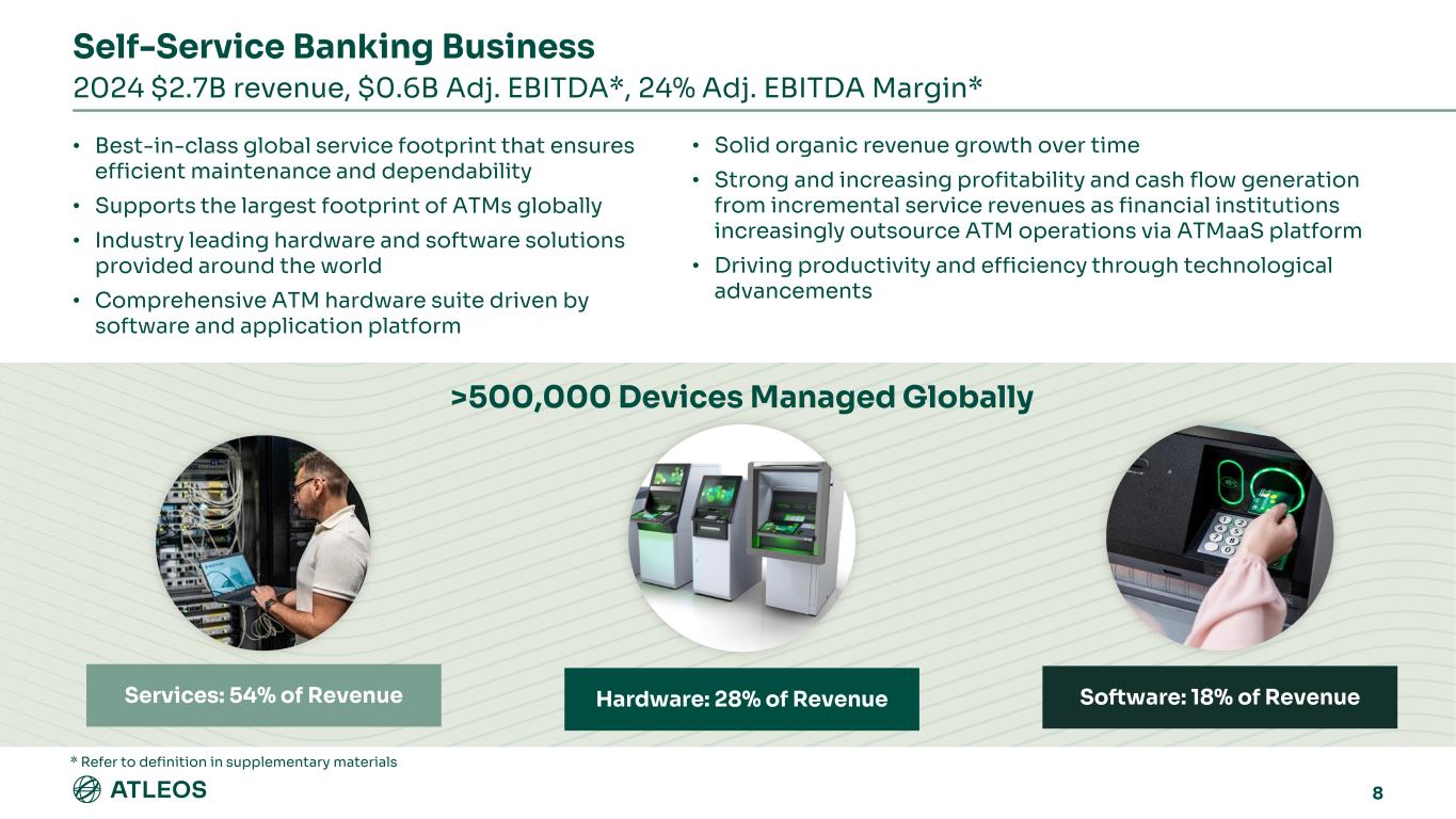 7 Solid Underlying Market Fundamentals • Value of ATM cash withdrawals projected 3-year CAGR 1.4% 2024-2027 • $2.4 trillion cash in circulation at an all-time high, 14-year CAGR 5% 2010-20243 • Consumers value cash: >90% of U.S. consumers intend to use cash as a means of payment, or a store of value, in the future4 70% Reliance on Cash Continues ATM Cash Withdrawal Total Value ($B)1 14,146 13,824 13,43213,566 13,785 14,004 2022 2023 2024 2025E 2026E 2027E • Global ATM installed base remains stable • Atleos historically has outperformed market growth trends • Superior service levels drive market share gain • #1 in shipped device share for 8 consecutive years1 • Atleos is #1 or #2 for ATM installed base in every region around the world1 • Capital intensity and high switching costs limit the incentives for new entrants 1. Third-party industry research 2. Third-party industry research adjusted to include only Atleos target markets 3. Federal Reserve Bank of St. Louis 4. 2024 Diary of Consumer Payment Choice Stable Base of ATM Devices Global ATM Installed Base (000s)2 Favorable Market Position Drive More Services Revenue Per Device 1,936 1,925 1,920 1,916 1,914 1,911 2022 2023 2024 2025E 2026E 2027E 35% 36% 15% 14% Atleos Diebold Hyosung Other