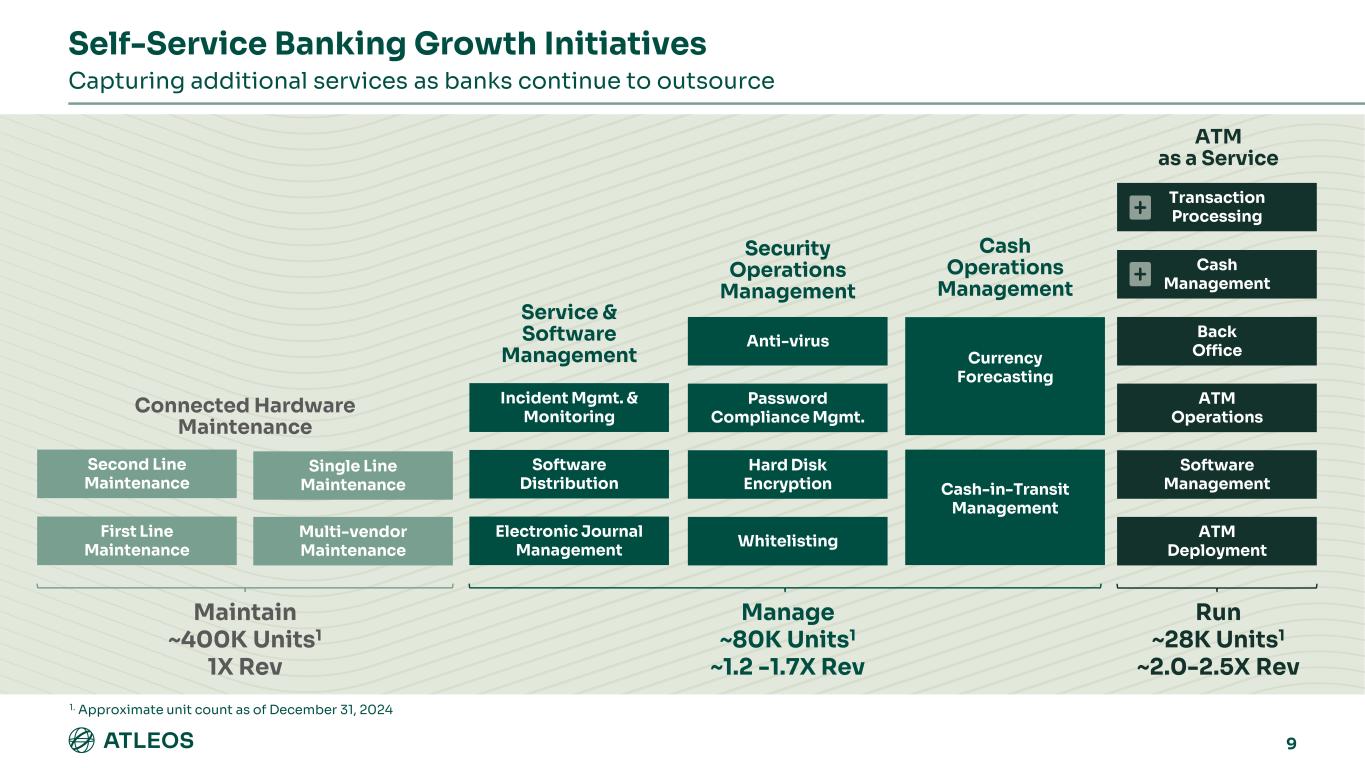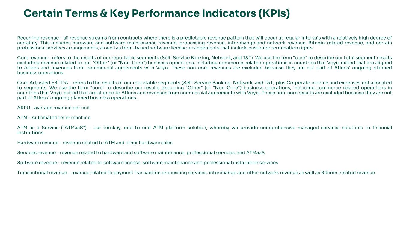 Recurring revenue - all revenue streams from contracts where there is a predictable revenue pattern that will occur at regular intervals with a relatively high degree of certainty. This includes hardware and software maintenance revenue, processing revenue, interchange and network revenue, Bitcoin-related revenue, and certain professional services arrangements, as well as term-based software license arrangements that include customer termination rights. Core revenue - refers to the results of our reportable segments (Self-Service Banking, Network, and T&T). We use the term "core" to describe our total segment results excluding revenue related to our "Other" (or "Non-Core") business operations, including commerce-related operations in countries that Voyix exited that are aligned to Atleos and revenues from commercial agreements with Voyix. These non-core revenues are excluded because they are not part of Atleos' ongoing planned business operations. Core Adjusted EBITDA - refers to the results of our reportable segments (Self-Service Banking, Network, and T&T) plus Corporate income and expenses not allocated to segments. We use the term "core" to describe our results excluding "Other" (or "Non-Core") business operations, including commerce-related operations in countries that Voyix exited that are aligned to Atleos and revenues from commercial agreements with Voyix. These non-core results are excluded because they are not part of Atleos' ongoing planned business operations. ARPU - average revenue per unit ATM - Automated teller machine ATM as a Service (“ATMaaS”) - our turnkey, end-to-end ATM platform solution, whereby we provide comprehensive managed services solutions to financial institutions. Hardware revenue - revenue related to ATM and other hardware sales Services revenue - revenue related to hardware and software maintenance, professional services, and ATMaaS Software revenue - revenue related to software license, software maintenance and professional installation services Transactional revenue - revenue related to payment transaction processing services, interchange and other network revenue as well as Bitcoin-related revenue Certain Terms & Key Performance Indicators (KPIs)