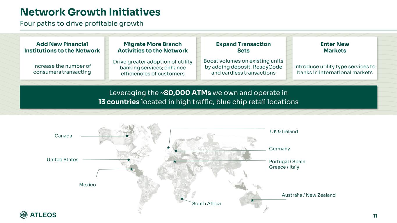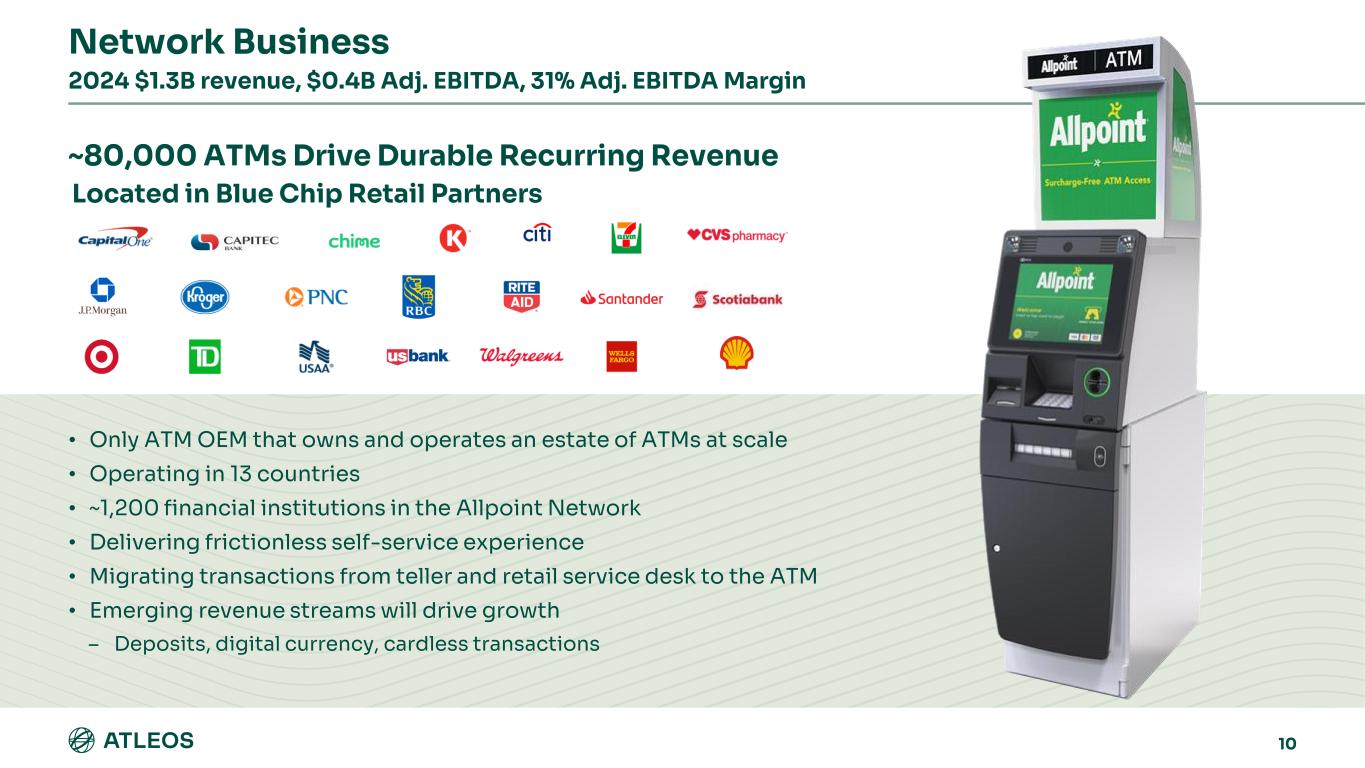 • Only ATM OEM that owns and operates an estate of ATMs at scale • Operating in 13 countries • ~1,200 financial institutions in the Allpoint Network • Delivering frictionless self-service experience • Migrating transactions from teller and retail service desk to the ATM • Emerging revenue streams will drive growth – Deposits, digital currency, cardless transactions Located in Blue Chip Retail Partners 2024 $1.3B revenue, $0.4B Adj. EBITDA, 31% Adj. EBITDA Margin Network Business ~80,000 ATMs Drive Durable Recurring Revenue 10