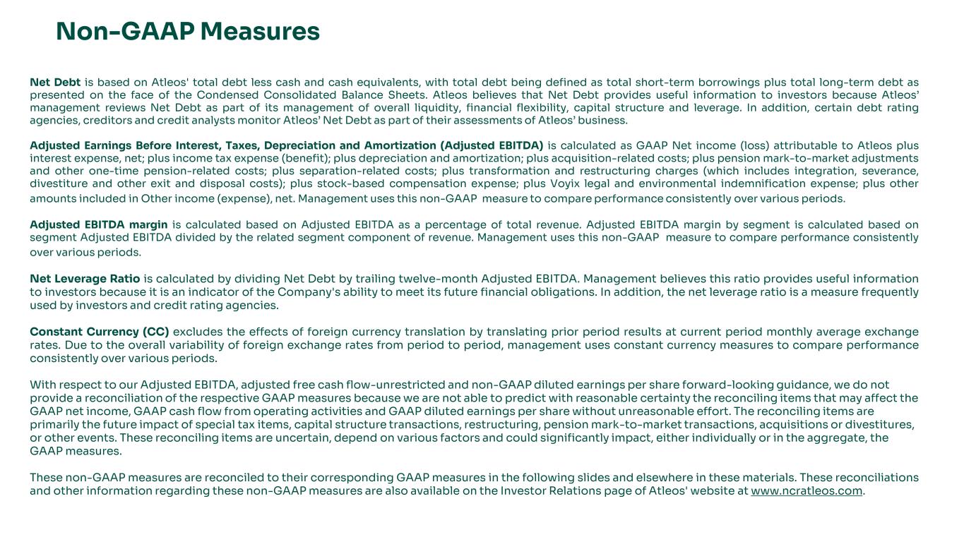 Net Debt is based on Atleos' total debt less cash and cash equivalents, with total debt being defined as total short-term borrowings plus total long-term debt as presented on the face of the Condensed Consolidated Balance Sheets. Atleos believes that Net Debt provides useful information to investors because Atleos’ management reviews Net Debt as part of its management of overall liquidity, financial flexibility, capital structure and leverage. In addition, certain debt rating agencies, creditors and credit analysts monitor Atleos’ Net Debt as part of their assessments of Atleos’ business. Adjusted Earnings Before Interest, Taxes, Depreciation and Amortization (Adjusted EBITDA) is calculated as GAAP Net income (loss) attributable to Atleos plus interest expense, net; plus income tax expense (benefit); plus depreciation and amortization; plus acquisition-related costs; plus pension mark-to-market adjustments and other one-time pension-related costs; plus separation-related costs; plus transformation and restructuring charges (which includes integration, severance, divestiture and other exit and disposal costs); plus stock-based compensation expense; plus Voyix legal and environmental indemnification expense; plus other amounts included in Other income (expense), net. Management uses this non-GAAP measure to compare performance consistently over various periods. Adjusted EBITDA margin is calculated based on Adjusted EBITDA as a percentage of total revenue. Adjusted EBITDA margin by segment is calculated based on segment Adjusted EBITDA divided by the related segment component of revenue. Management uses this non-GAAP measure to compare performance consistently over various periods. Net Leverage Ratio is calculated by dividing Net Debt by trailing twelve-month Adjusted EBITDA. Management believes this ratio provides useful information to investors because it is an indicator of the Company's ability to meet its future financial obligations. In addition, the net leverage ratio is a measure frequently used by investors and credit rating agencies. Constant Currency (CC) excludes the effects of foreign currency translation by translating prior period results at current period monthly average exchange rates. Due to the overall variability of foreign exchange rates from period to period, management uses constant currency measures to compare performance consistently over various periods. With respect to our Adjusted EBITDA, adjusted free cash flow-unrestricted and non-GAAP diluted earnings per share forward-looking guidance, we do not provide a reconciliation of the respective GAAP measures because we are not able to predict with reasonable certainty the reconciling items that may affect the GAAP net income, GAAP cash flow from operating activities and GAAP diluted earnings per share without unreasonable effort. The reconciling items are primarily the future impact of special tax items, capital structure transactions, restructuring, pension mark-to-market transactions, acquisitions or divestitures, or other events. These reconciling items are uncertain, depend on various factors and could significantly impact, either individually or in the aggregate, the GAAP measures. These non-GAAP measures are reconciled to their corresponding GAAP measures in the following slides and elsewhere in these materials. These reconciliations and other information regarding these non-GAAP measures are also available on the Investor Relations page of Atleos' website at www.ncratleos.com. Non-GAAP Measures