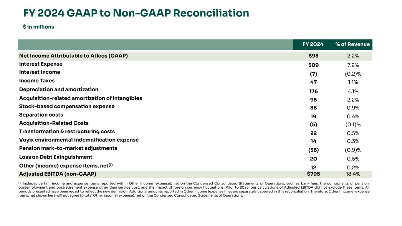 FY 2024 % of Revenue Net Income Attributable to Atleos (GAAP) $93 2.2% Interest Expense 309 7.2% Interest Income (7) (0.2)% Income Taxes 47 1.1% Depreciation and amortization 176 4.1% Acquisition-related amortization of intangibles 95 2.2% Stock-based compensation expense 38 0.9% Separation costs 19 0.4% Acquisition-Related Costs (5) (0.1)% Transformation & restructuring costs 22 0.5% Voyix environmental indemnification expense 14 0.3% Pension mark-to-market adjustments (38) (0.9)% Loss on Debt Exinguishment 20 0.5% Other (income) expense items, net(1) 12 0.2% Adjusted EBITDA (non-GAAP) $795 18.4% $ in millions (1) Includes certain income and expense items reported within Other income (expense), net on the Condensed Consolidated Statements of Operations, such as bank fees, the components of pension, postemployment and postretirement expense other than service cost, and the impact of foreign currency fluctuations. Prior to 2025, our calculations of Adjusted EBITDA did not exclude these items. All periods presented have been recast to reflect the new definition. Additional amounts reported in Other income (expense), net are separately captured in this reconciliation. Therefore, Other (income) expense items, net shown here will not agree to total Other income (expense), net on the Condensed Consolidated Statements of Operations. FY 2024 GAAP to Non-GAAP Reconciliation
