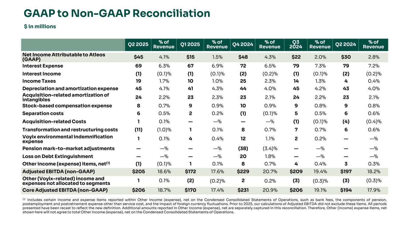 Q2 2025 % of Revenue Q1 2025 % of Revenue Q4 2024 % of Revenue Q3 2024 % of Revenue Q2 2024 % of Revenue Net Income Attributable to Atleos (GAAP) $45 4.1% $15 1.5% $48 4.3% $22 2.0% $30 2.8% Interest Expense 69 6.3% 67 6.9% 72 6.5% 79 7.3% 79 7.2% Interest Income (1) (0.1)% (1) (0.1)% (2) (0.2)% (1) (0.1)% (2) (0.2)% Income Taxes 19 1.7% 10 1.0% 25 2.3% 14 1.3% 4 0.4% Depreciation and amortization expense 45 4.1% 41 4.3% 44 4.0% 45 4.2% 43 4.0% Acquisition-related amortization of intangibles 24 2.2% 23 2.3% 23 2.1% 24 2.2% 23 2.1% Stock-based compensation expense 8 0.7% 9 0.9% 10 0.9% 9 0.8% 9 0.8% Separation costs 6 0.5% 2 0.2% (1) (0.1)% 5 0.5% 6 0.6% Acquisition-related Costs 1 0.1% — —% — —% (1) (0.1)% (4) (0.4)% Transformation and restructuring costs (11) (1.0)% 1 0.1% 8 0.7% 7 0.7% 6 0.6% Voyix environmental indemnification expense 1 0.1% 4 0.4% 12 1.1% 2 0.2% — —% Pension mark-to-market adjustments — —% — —% (38) (3.4)% — —% — —% Loss on Debt Extinguishment — —% — —% 20 1.8% — —% — —% Other income (expense) items, net(1) (1) (0.1)% 1 0.1% 8 0.7% 4 0.4% 3 0.3% Adjusted EBITDA (non-GAAP) $205 18.6% $172 17.6% $229 20.7% $209 19.4% $197 18.2% Other (Voyix-related) income and expenses not allocated to segments 1 0.1% (2) (0.2)% 2 0.2% (3) (0.3)% (3) (0.3)% Core Adjusted EBITDA (non-GAAP) $206 18.7% $170 17.4% $231 20.9% $206 19.1% $194 17.9% $ in millions (1) Includes certain income and expense items reported within Other income (expense), net on the Condensed Consolidated Statements of Operations, such as bank fees, the components of pension, postemployment and postretirement expense other than service cost, and the impact of foreign currency fluctuations. Prior to 2025, our calculations of Adjusted EBITDA did not exclude these items. All periods presented have been recast to reflect the new definition. Additional amounts reported in Other income (expense), net are separately captured in this reconciliation. Therefore, Other (income) expense items, net shown here will not agree to total Other income (expense), net on the Condensed Consolidated Statements of Operations. GAAP to Non-GAAP Reconciliation