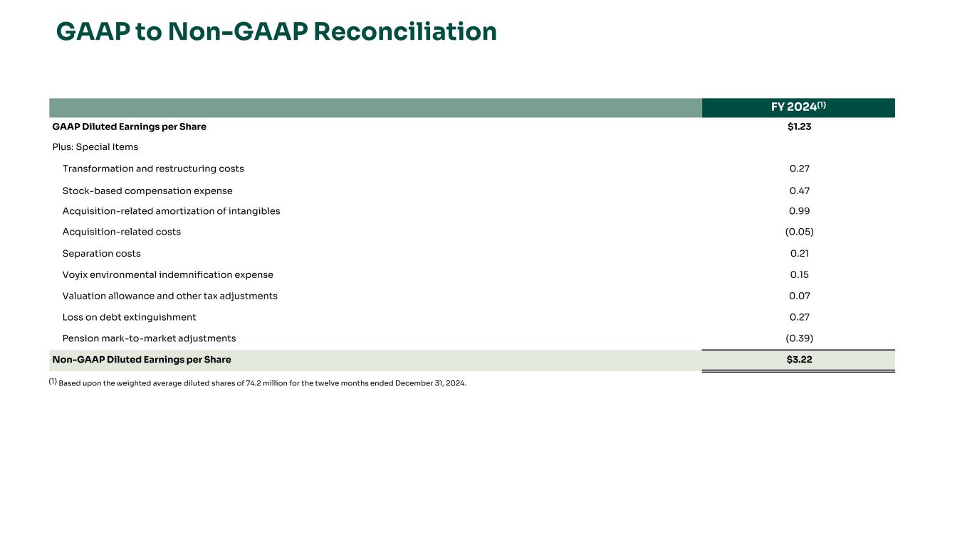 FY 2024(1) GAAP Diluted Earnings per Share $1.23 Plus: Special Items Transformation and restructuring costs 0.27 Stock-based compensation expense 0.47 Acquisition-related amortization of intangibles 0.99 Acquisition-related costs (0.05) Separation costs 0.21 Voyix environmental indemnification expense 0.15 Valuation allowance and other tax adjustments 0.07 Loss on debt extinguishment 0.27 Pension mark-to-market adjustments (0.39) Non-GAAP Diluted Earnings per Share $3.22 (1) Based upon the weighted average diluted shares of 74.2 million for the twelve months ended December 31, 2024. GAAP to Non-GAAP Reconciliation
