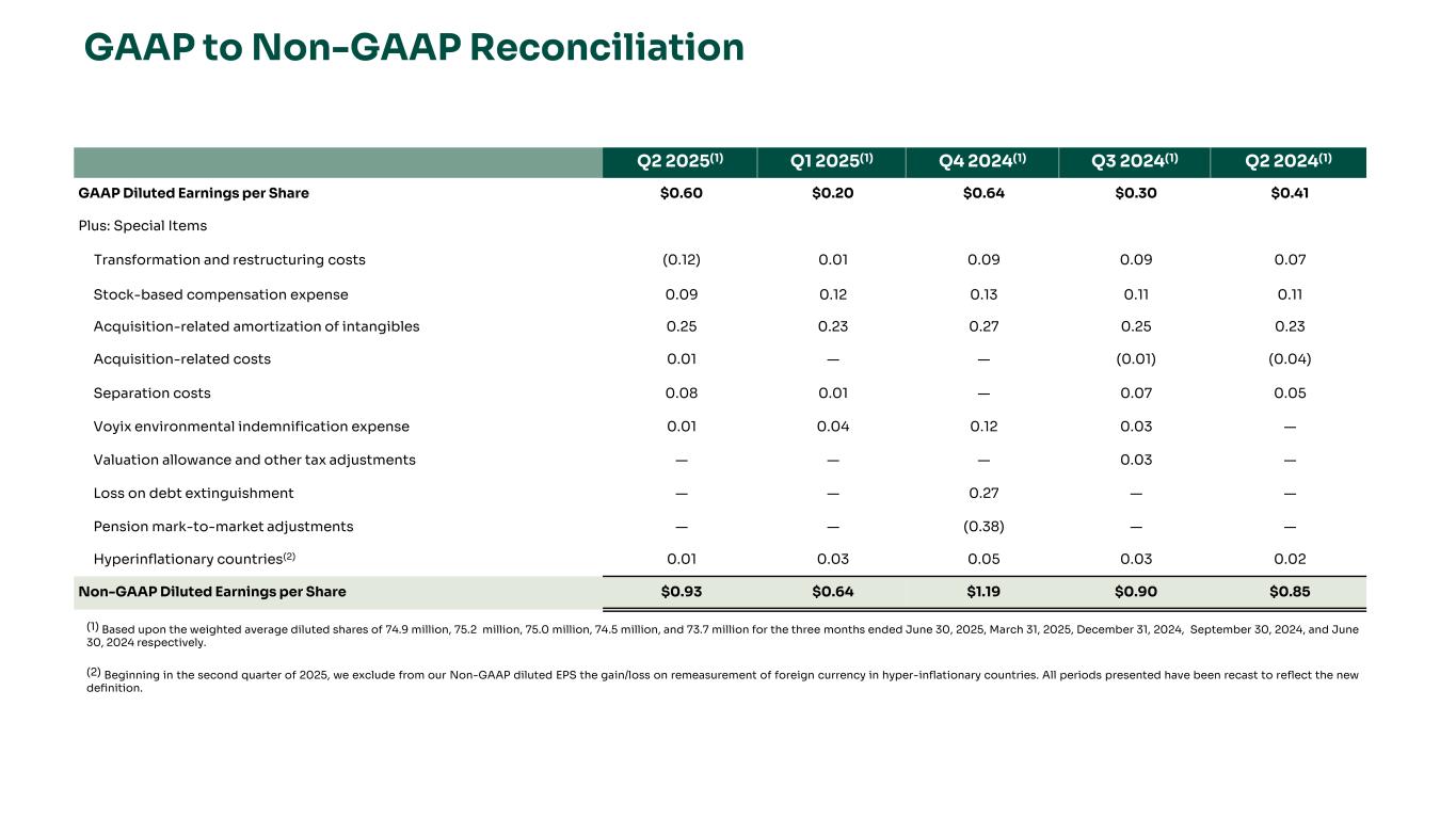 Q2 2025(1) Q1 2025(1) Q4 2024(1) Q3 2024(1) Q2 2024(1) GAAP Diluted Earnings per Share $0.60 $0.20 $0.64 $0.30 $0.41 Plus: Special Items Transformation and restructuring costs (0.12) 0.01 0.09 0.09 0.07 Stock-based compensation expense 0.09 0.12 0.13 0.11 0.11 Acquisition-related amortization of intangibles 0.25 0.23 0.27 0.25 0.23 Acquisition-related costs 0.01 — — (0.01) (0.04) Separation costs 0.08 0.01 — 0.07 0.05 Voyix environmental indemnification expense 0.01 0.04 0.12 0.03 — Valuation allowance and other tax adjustments — — — 0.03 — Loss on debt extinguishment — — 0.27 — — Pension mark-to-market adjustments — — (0.38) — — Hyperinflationary countries(2) 0.01 0.03 0.05 0.03 0.02 Non-GAAP Diluted Earnings per Share $0.93 $0.64 $1.19 $0.90 $0.85 (1) Based upon the weighted average diluted shares of 74.9 million, 75.2 million, 75.0 million, 74.5 million, and 73.7 million for the three months ended June 30, 2025, March 31, 2025, December 31, 2024, September 30, 2024, and June 30, 2024 respectively. (2) Beginning in the second quarter of 2025, we exclude from our Non-GAAP diluted EPS the gain/loss on remeasurement of foreign currency in hyper-inflationary countries. All periods presented have been recast to reflect the new definition. GAAP to Non-GAAP Reconciliation