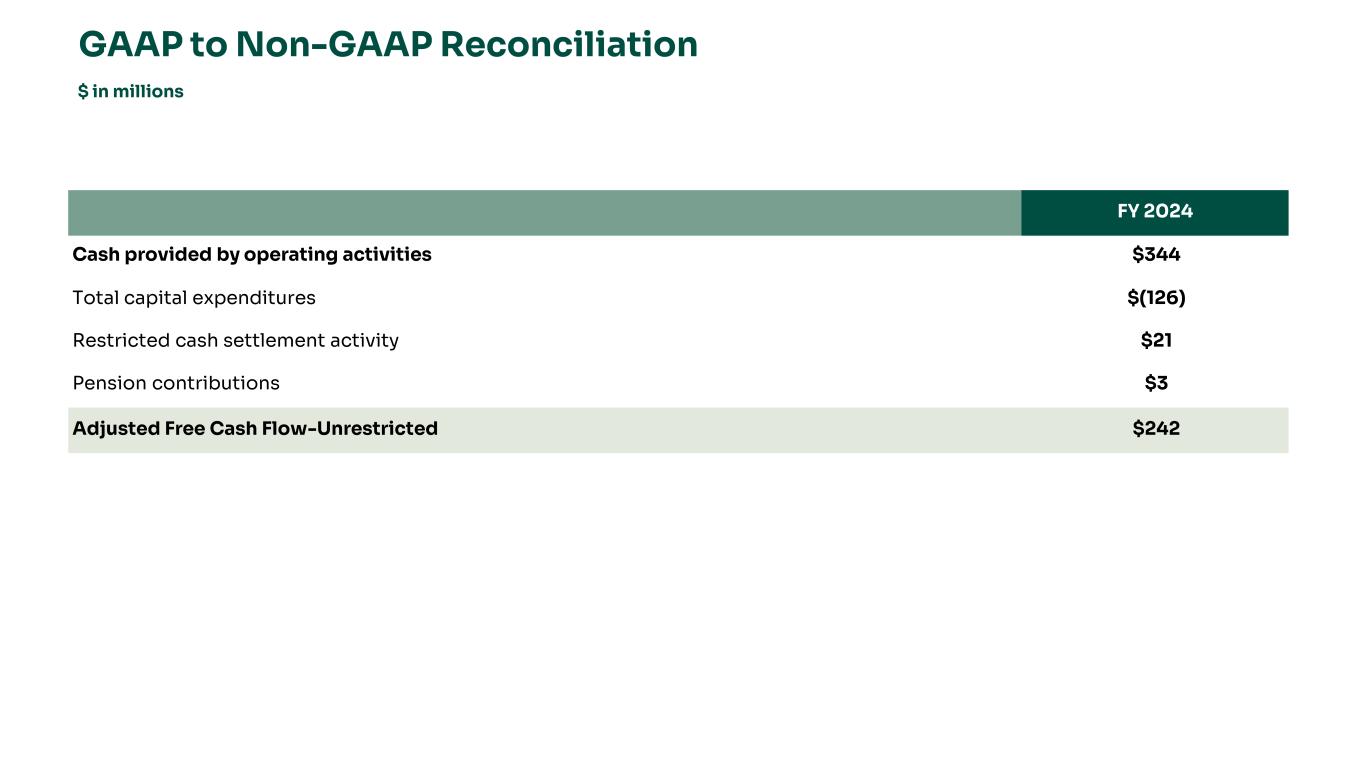FY 2024 Cash provided by operating activities $344 Total capital expenditures $(126) Restricted cash settlement activity $21 Pension contributions $3 Adjusted Free Cash Flow-Unrestricted $242 $ in millions GAAP to Non-GAAP Reconciliation
