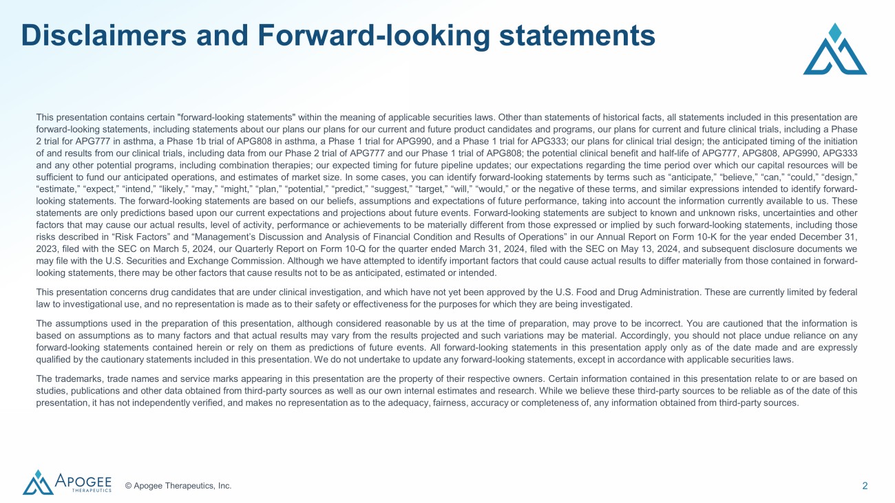 2 © Apogee Therapeutics, Inc. Disclaimers and Forward - looking statements This presentation contains certain "forward - looking statements" within the meaning of applicable securities laws . Other than statements of historical facts, all statements included in this presentation are forward - looking statements, including statements about our plan s our plans for our current and future product candidates and programs, our plans for current and future clinical trials, including a Phase 2 trial for APG 777 in asthma, a Phase 1 b trial of APG 808 in asthma, a Phase 1 trial for APG 990 , and a Phase 1 trial for APG 333 ; our plans for clinical trial design ; the anticipated timing of the initiation of and results from our clinical trials, including data from our Phase 2 trial of APG 777 and our Phase 1 trial of APG 808 ; the potential clinical benefit and half - life of APG 777 , APG 808 , APG 990 , APG 333 and any other potential programs, including combination therapies ; our expected timing for future pipe line updates ; our expectations regarding the time period over which our capital resources will be sufficient to fund our anticipated operations, and estimates of market size . In some cases, you can identify forward - looking statements by terms such as “anticipate,” “believe,” “can,” “could,” “design,” “estimate,” “expect,” “intend,” “likely,” “may,” “might,” “plan,” “potential,” “predict,” “suggest,” “target,” “will,” “would,” or the negative of these terms, and similar expressions intended to identify forward - looking statements . The forward - looking statements are based on our beliefs, assumptions and expectations of future performance, taking into account the information currently available to us . These statements are only predictions based upon our current expectations and projections about future events . Forward - looking statements are subject to known and unknown risks, uncertainties and other factors that may cause our actual results, level of activity, performance or achievements to be materially different from those expressed or implied by such forward - looking statements, including those risks described in “Risk Factors” and “Management’s Discussion and Analysis of Financial Condition and Results of Operations” in our Annual Report on Form 10 - K for the year ended December 31 , 2023 , filed with the SEC on March 5 , 2024 , our Quarterly Report o n Form 10 - Q for the quarter ended March 31 , 2024 , filed with the SEC on May 13 , 2024 , and subsequent disclosure documents we may file with the U . S . Securities and Exchan ge Commission . Although we have attempted to identify important factors that could cause actual results to differ materially from those contained in forward - looking statements, there may be other factors that cause results not to be as anticipated, estimated or intended . This presentation concerns drug candidates that are under clinical investigation, and which have not yet been approved by the U . S . Food and Drug Administration . These are currently limited by federal law to investigational use, and no representation is made as to their safety or effectiveness for the purposes for which they are being investigated . The assumptions used in the preparation of this presentation, although considered reasonable by us at the time of preparation, may prove to be incorrect . You are cautioned that the information is based on assumptions as to many factors and that actual results may vary from the results projected and such variations may be material . Accordingly, you should not place undue reliance on any forward - looking statements contained herein or rely on them as predictions of future events . All forward - looking statements in this presentation apply only as of the date made and are expressly qualified by the cautionary statements included in this presentation . We do not undertake to update any forward - looking statements, except in accordance with applicable securities laws . The trademarks, trade names and service marks appearing in this presentation are the property of their respective owners . Certain information contained in this presentation relate to or are based on studies, publications and other data obtained from third - party sources as well as our own internal estimates and research . While we believe these third - party sources to be reliable as of the date of this presentation, it has not independently verified, and makes no representation as to the adequacy, fairness, accuracy or completeness of, any information obtained from third - party sources .