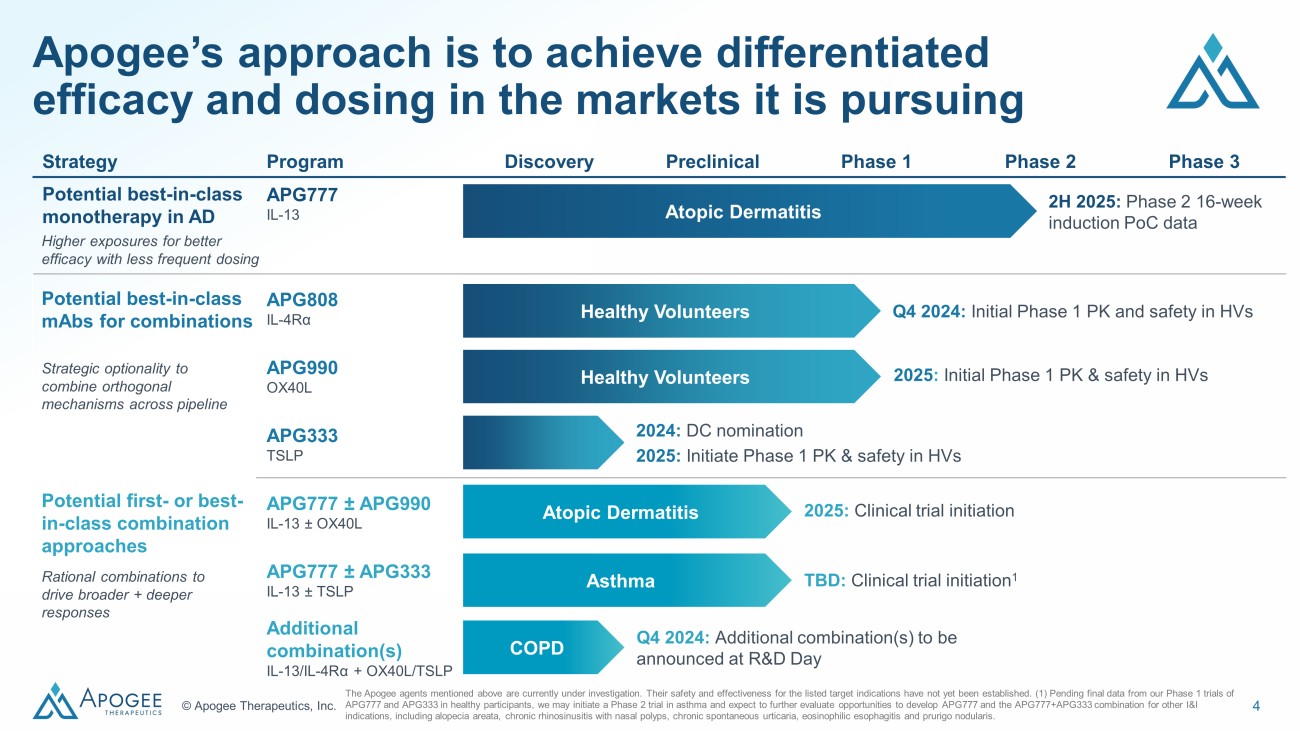 3 © Apogee Therapeutics, Inc. Apogee plans to reshape the current standard of care for I&I diseases with its potential therapies Best - in - class monotherapy in atopic dermatitis • Less frequent dosing with potential for increased efficacy through higher exposures Best - in - class combination therapies in asthma and COPD • Strategic optionality to combine orthogonal validated mechanisms across pipeline First - in - class combination therapy in atopic dermatitis • Rational combination targeting orthogonal mechanisms with potential for best - in - class efficacy and dosing Broad potential in I&I with 10+ possible expansion indications