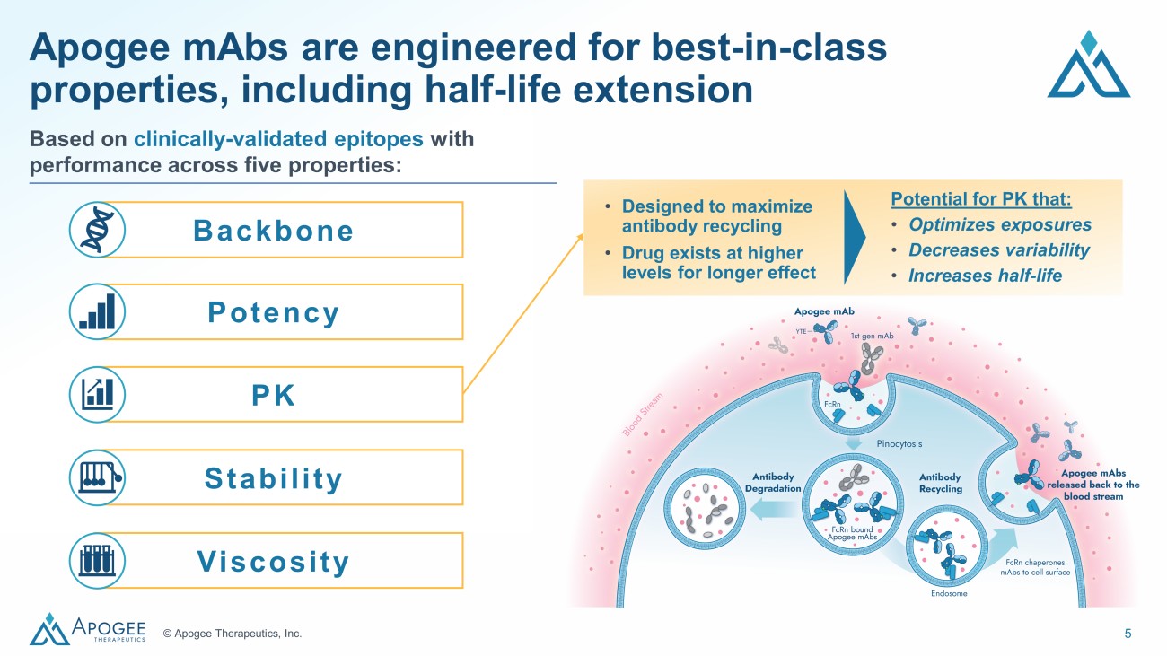 4 © Apogee Therapeutics, Inc. Apogee’s approach is to achieve differentiated efficacy and dosing in the markets it is pursuing Strategy Program Discovery Preclinical Phase 1 Phase 2 Phase 3 Potential best - in - class monotherapy in AD APG777 IL - 13 APG808 IL - 4R α APG990 OX40L APG333 TSLP APG777 ± APG990 IL - 13 ± OX40L APG777 ± APG333 IL - 13 ± TSLP Additional combination(s) IL - 13/ IL - 4R α + OX40L/ TSLP The Apogee agents mentioned above are currently under investigation. Their safety and effectiveness for the listed target ind ica tions have not yet been established. (1) Pending final data from our Phase 1 trials of APG777 and APG333 in healthy participants, we may initiate a Phase 2 trial in asthma and expect to further evaluate opportuni tie s to develop APG777 and the APG777+APG333 combination for other I&I indications, including alopecia areata, chronic rhinosinusitis with nasal polyps, chronic spontaneous urticaria, eosinophilic es ophagitis and prurigo nodularis. Higher exposures for better efficacy with less frequent dosing Atopic Dermatitis 2H 2025: Phase 2 16 - week induction PoC data Potential first - or best - in - class combination approaches Rational combinations to drive broader + deeper responses Healthy Volunteers Q4 2024: Initial Phase 1 PK and safety in HVs 2024: DC nomination 2025: Initiate Phase 1 PK & safety in HVs Atopic Dermatitis 2025: Clinical trial initiation COPD Q4 2024: Additional combination(s) to be announced at R&D Day Asthma TBD: Clinical trial initiation 1 Healthy Volunteers 2025 : Initial Phase 1 PK & safety in HVs Potential best - in - class mAbs for combinations Strategic optionality to combine orthogonal mechanisms across pipeline