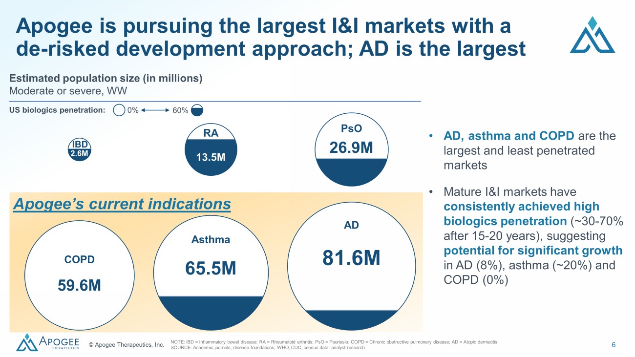 5 © Apogee Therapeutics, Inc. Apogee mAbs are engineered for best - in - class properties, including half - life extension Potential for PK that: • Optimizes exposures • Decreases variability • Increases half - life • Designed to maximize antibody recycling • Drug exists at higher levels for longer effect Potency Viscosity PK Stability Backbone Based on clinically - validated epitopes with performance across five properties: