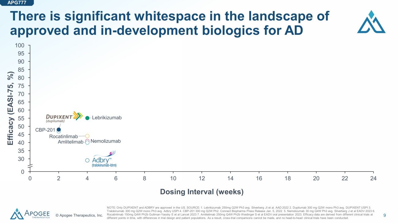 8 © Apogee Therapeutics, Inc. 0 2 4 6 8 10 12 14 16 18 20 22 24 50 40 60 0 70 100 80 90 Dosing Interval (weeks) Efficacy (PASI - 75, %) In psoriasis, an analog to AD, Skyrizi has taken the lead with quarterly dosing NOTE: Year denotes US launch year for adults with moderate to severe plaque psoriasis. Efficacy data are derived from differe nt clinical trials at different points in time, with differences in trial design, patient populations, and statistical analysis. As a result, cross - trial comparisons cannot be made. No head - to - head trials have been conducted among all biologics shown. Assumes 1 EUR = 1.07 USD. 1 Real - world evidence shows Skyrizi patients experienced fewer drug changes and a higher probability of drug survival compared wit h those treated with other biologic therapies for PsO and PsA SOURCE: Armstrong AW, et al JAMA Dermatol. 2020, Gordon KB, et al Lancet 2021. Reich K, et al Lancet 2021 . GlobalData. EvaluatePharma . USPIs. Wall Street research and management projections. Erik L et al ACR Convergence 2023. PsO = Psoriasis. PsA = Psoriatic Arthritis. Most pts respond (83 - 89% PASI - 75) $10.0B (Approved 2019) $4.9B (Approved 2009) $5.2B (Approved 2017) $5.3B (Approved 2015) $2.5B (Approved 2016) $4.0B (Approved 2008) Biologics with estimated WW peak sales in psoriasis and approval year $4.3B (Approved 2023) APG777 $1.9B (Approved 2004) • In 2024, 6 biologics each projected to exceed $2B in PsO alone • With quarterly dosing, Skyrizi leads a crowded market with 35% share • Patients stay on Skyrizi longer and are less likely to switch 1