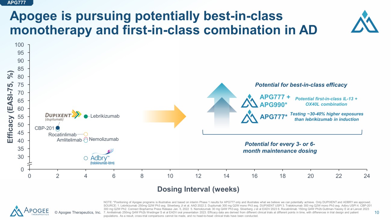 9 © Apogee Therapeutics, Inc. There is significant whitespace in the landscape of approved and in - development biologics for AD NOTE: Only DUPIXENT and ADBRY are approved in th e US . SOURCE: 1. Lebrikizumab 250mg Q2W Ph3 avg. Silverberg JI et al. AAD 2022 2. Dupilumab 300 mg Q2W mono Ph3 avg. DUPIXENT USP I 3 . Tralokinumab 300 mg Q2W mono Ph3 avg. Adbry USPI 4. CBP - 201 300 mg Q2W Ph2. Connect Biopharma Press Release Jan. 5, 2022 5. Nemolizumab 30 mg Q4W Ph3 avg. Silverberg J et al EADV 2023 6. Rocatinlimab 150mg Q4W Ph2b Guttman - Yassky E et al Lancet 2023 7. Amlitelimab 250mg Q4W Ph2b Weidinger S et al EADV oral presentation 2023. Efficacy data are derived from different clinical trials at different points in time, with differences in trial design and patient populations. As a result, cross - trial comparisons cannot be made, and no head - to - head clinical trials have been conducted. APG777 0 2 4 6 8 10 12 14 16 18 20 22 24 55 60 50 65 45 70 40 75 35 80 30 85 0 90 100 95 Nemolizumab Dosing Interval (weeks) CBP - 201 Amlitelimab Tralokinumab Dupilumab Lebrikizumab Rocatinlimab Efficacy (EASI - 75, %)